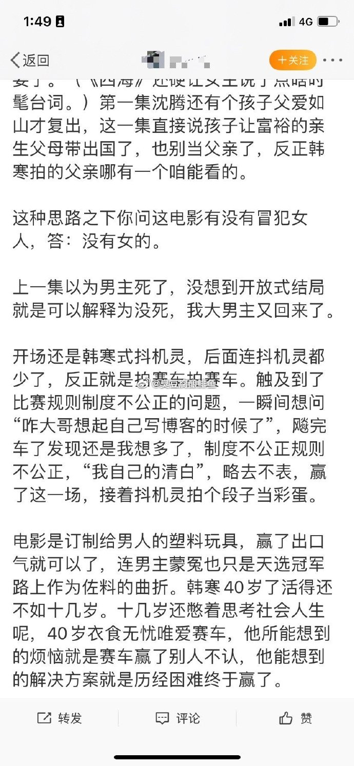 要想弄懂极氪这件事,那你就要了解飞驰人生发生了什么。最早韩寒的电影《后会无期》里面的王珞丹饰演的女性角色被声讨,认为侮辱了女性。(就是包夜XXX元)。然后飞驰人生1的女性角色戏份太少,像花瓶再次被声讨。要求提高戏份增加女性闪光点。然后飞驰人生2直接取消女性角色,票房大爆,但是再次被声讨没有女性角色然后飞驰人生3没有女性角色,票房大爆,但是还是被声讨没有女性角色。这里就陷入了一个ZZZQ的事件了,你不能没有女性,你的女性必须是正面的,是高光的。对了,你有没有发现就如同灯塔电影一样,必须要有一个亚裔,还要一个深色,同时幕后BOSS不是能是深色。是不是有异曲同工之妙了?没错,这就是她们发展出来的ZZZQ。在这里她将无敌天下。你只要陷入这个怪圈你就没有办法脱离出去,那以后的电影就永远都是女性高光,女性正面。无敌金身,你还看什么电影呢?对不对。韩寒和黑神哈就是两个不管这些事的人。然后只专注作品,不关注所谓的女性平等这种,只能她说了算的局面。土豆厂为什么游戏连自家人都看不下去?就是因为DEI,也是因为在意某些女性平等。甚至还创造出来了深色武士来讨好。所以,你极氪你说女性平等这些都没有问题,你说女性贡献都没有问题,大家都不会说什么。但极氪是某人一手搞定的吗、以点概面,摘桃子。我问一句:她成功就是所有女人的成功?那她的失败是不是所有女性失败?弄懂这些。你再来看,里面说飞驰人生没有女性角色,为什么?这就是夹带私货的骂韩寒,骂整个行业。你要还觉得,你还记得那个XX女工,火花洗脸的事情吗?人家就是直接把行业都带进来,这不是我的错,是行业的错。