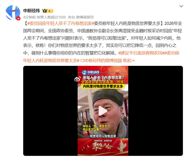 委员回应年轻人受不了内卷想出家 出家?以为寺、观里面是彻底的清净圣地?去里面找找老年人,找到后,问问