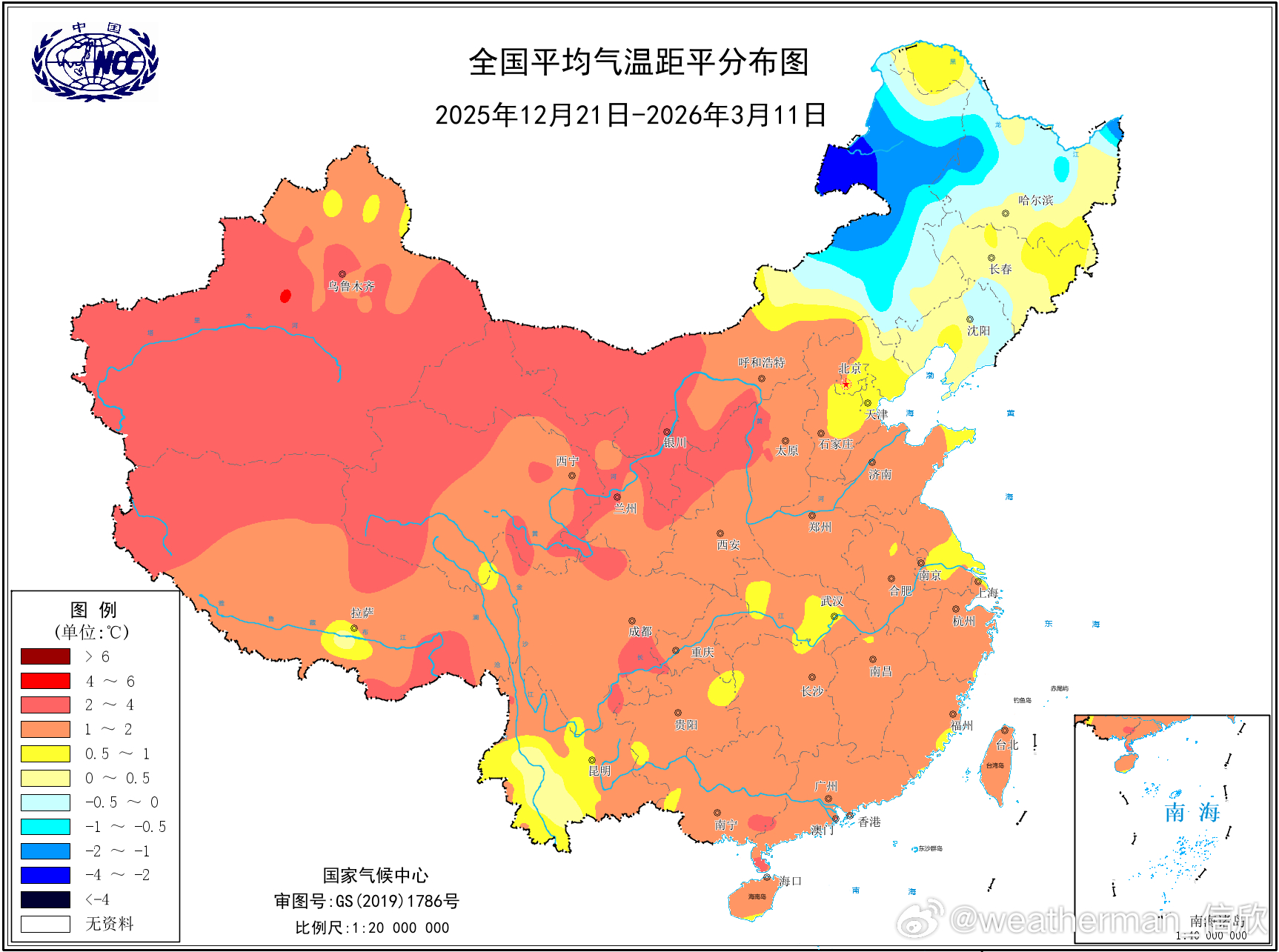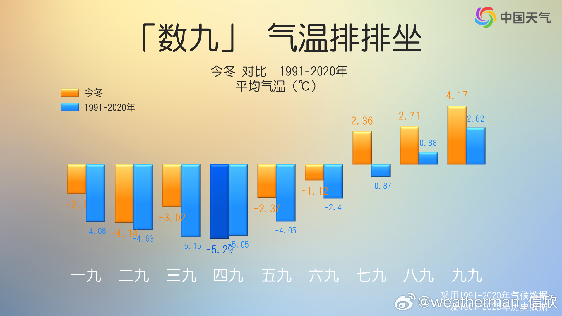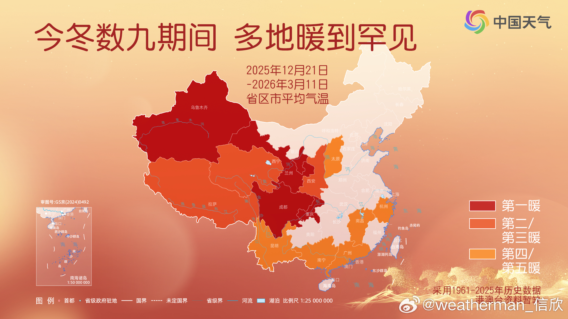 【最暖的数九】今冬数九(2025年12月21日-2026年3月11日),我国面积加权平均气温为零下0.98℃,较常年偏高1.48℃,为1961年以来最暖的数九。从空间分布看,西部偏暖更明显,新疆甘肃宁夏四川为同期最暖。从时间分布看,四九最冷,也是唯一气温偏低的九天组。