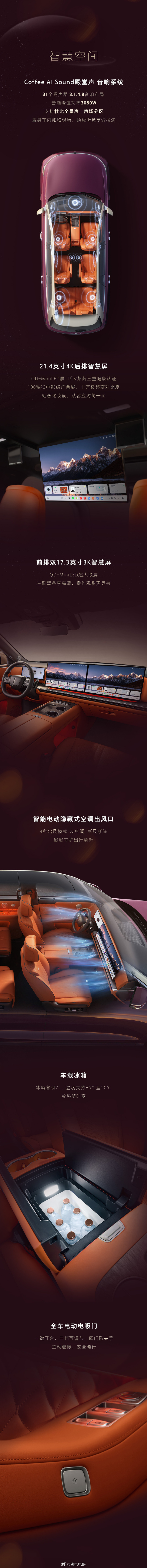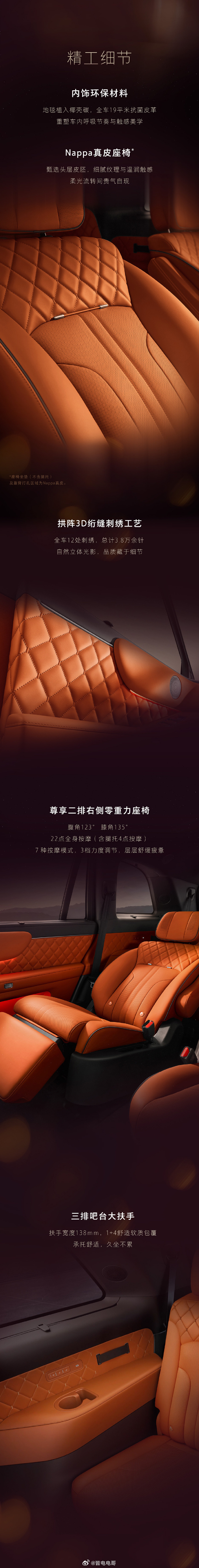 新车为三排六座的布局,得房率70.2%,支持一二排成床。Nappa真皮座椅,尊享二排右侧零重力座椅搭载Coffee AI Sound殿堂声音响系统配备21.4英寸4K后排智慧屏、前排双17.3英寸3K智慧屏