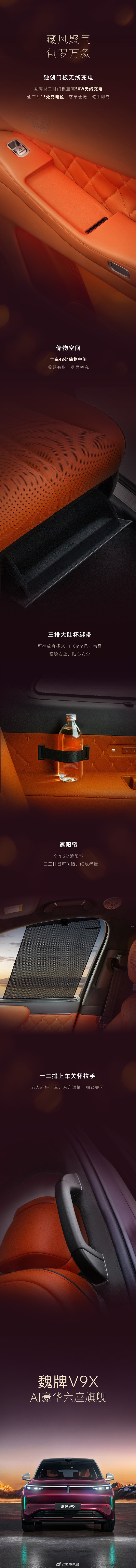 有意思的是魏牌V9X独创了门板无线充电,副驾及二排门板至高 50W 无线充电,全车共 13 处充电位