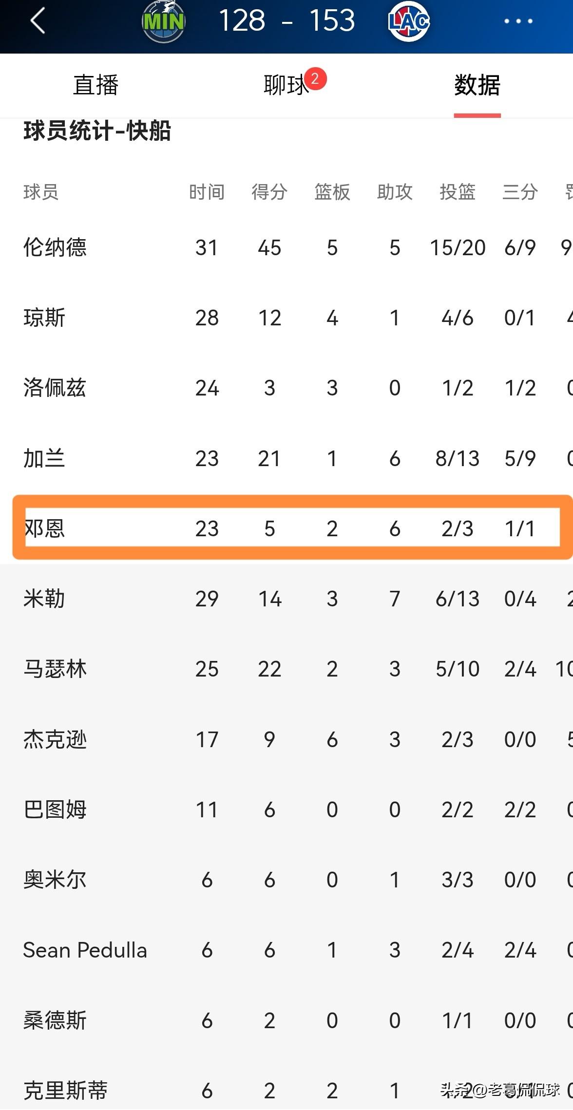 快船大将邓恩在球队的地位真是太特殊了!在今天快船主场以153:128大胜森林狼的比赛中,虽然邓恩在进攻端的表现并不出彩,但是他却为球队做出了巨大的贡献,他的价值完全无法用数据统计来体现。 整场比赛下来,邓恩首发出战23分钟,投篮3中2,其中三分球1中1得到5分2篮板6助攻4抢断,他的场上正负值为+17。 以我的拙见来看,快船可以缺少加兰、马瑟林,但是快船不能缺少邓恩,有没有邓恩快船完全是两支完全不同的球队。