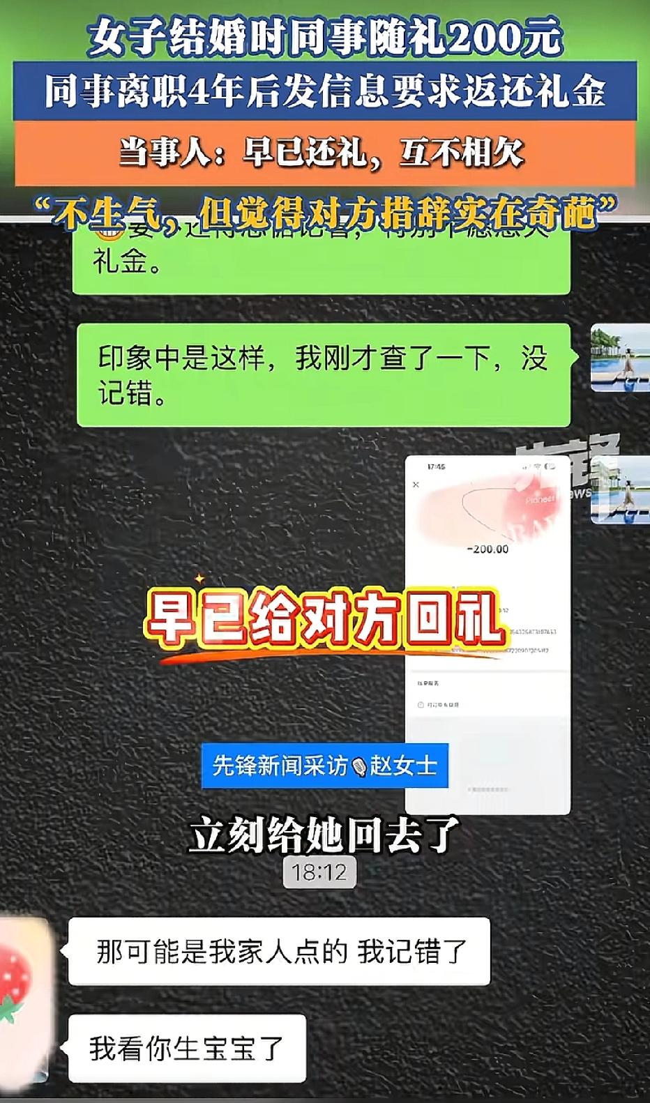 河北石家庄,女子结婚时,刚入职不久的同事随了200元礼金。没想到4年后,离职的同事突然发来短信,张口就要她把这200元还回去。女子当场懵了,直接回怼:两年前你生孩子的时候就已经随回去,还将当年的转账截图甩给对方。同事却称:可能是家里人点的,看你生宝宝了。 赵女士遇到一件让她哭笑不得又无比无语的事。 前同事理直气壮的找她要钱的措辞,更是让她直呼大开眼界,直言对方的态度实在太过奇葩。 事情要从2021年9月说起,当时赵女士在公司举办婚礼,按照职场习俗,身边同事纷纷送上祝福与礼金。 其中一位刚入职不久的新同事,也主动给赵女士转来了200元礼金。 因为两人平时交流不多,工作交集也少,赵女士当时还觉得十分不好意思,心里默默记下这份人情。 她一直坚信,礼金讲究礼尚往来,绝不欠别人半分人情,等对方有喜事,一定要第一时间还回去。 可让她没想到的是,婚礼结束仅仅一个月,这位随礼的同事便提出离职,从此离开了公司。 两人没有私交,也没有日常联系,就这样安安静静躺在彼此的好友列表里,渐渐淡出了对方的生活。 2022年7月,赵女士偶然刷到这位前同事的朋友圈,得知对方顺利生下宝宝。 看到消息的那一刻,赵女士第一时间就想起了当年那200元礼金。她没有丝毫犹豫,立刻给对方转回200元,并附上祝福,希望宝宝健康快乐成长。 在赵女士心里,这件事到此已经两清,互不相欠。 对方收下钱款后,两人依旧没有多余交流,之后的两年多时间里,更是如同陌生人一般,没有任何互动。 让赵女士没想到的是,四年前早已断了往来的前同事,竟会因为她一条报喜的朋友圈,找上门来,还提出一个过分的要求。 不久前,赵女士诞下宝宝,开心地在朋友圈分享了这份为人母的喜悦。 对方没有寒暄,没有问候,一上来就直接提及四年前随礼的事情,还称自己赚钱不容易,语气生硬又理直气壮,明确要求赵女士把当年200元礼金还回去。 同时还表示自己以后生二胎的话,到时候不用赵女士上礼金了。 看到这样的措辞,赵女士又气又好笑,心里瞬间涌上一股无语的感觉。 她怎么也想不到,一段早已断联的关系,一笔早已还清的礼金,会以这样突兀又奇葩的方式被重新提起。 她立刻回复对方,明确表示:这笔钱我早就还你了,2022年你生孩子的时候,我就已经如数转回。 为了自证清白,赵女士耐心翻出当年的转账记录,将清晰的转账截图、时间、备注一并发送给对方。 铁证摆在面前,她本以为对方会感到愧疚,甚至道歉,可接下来的回复,让赵女士彻底刷新了认知。 她坦言,对方的态度实在太过奇葩,仿佛四年的礼尚往来在她眼里一文不值,仿佛自己还礼的行为从未发生过。 赵女士表示,自己从不是爱占小便宜的人,当年对方随礼后迅速离职,她还特意留意对方动态,生怕错过还礼的机会,就是不想亏欠任何人情。 可她的真诚与守礼,换来的却是四年后被人突然上门要钱,连一句基本的歉意都没有。 200元钱不多,却足以看清一个人的人品。 《民法典》第657条规定:赠与合同是赠与人将自己的财产无偿给予受赠人,受赠人表示接受赠与的合同。 同事随礼是无偿祝福,既无附义务,也无上述法定撤销事由,无权以“赚钱不易”“以后生二胎不用随礼”为由要回礼金。 女方在同事生孩子时转回200元,本质上是反向赠与,双方互负的人情债在法律上已结清。 200元虽少,却照出了最真实的人情冷暖。 对此你怎么看?