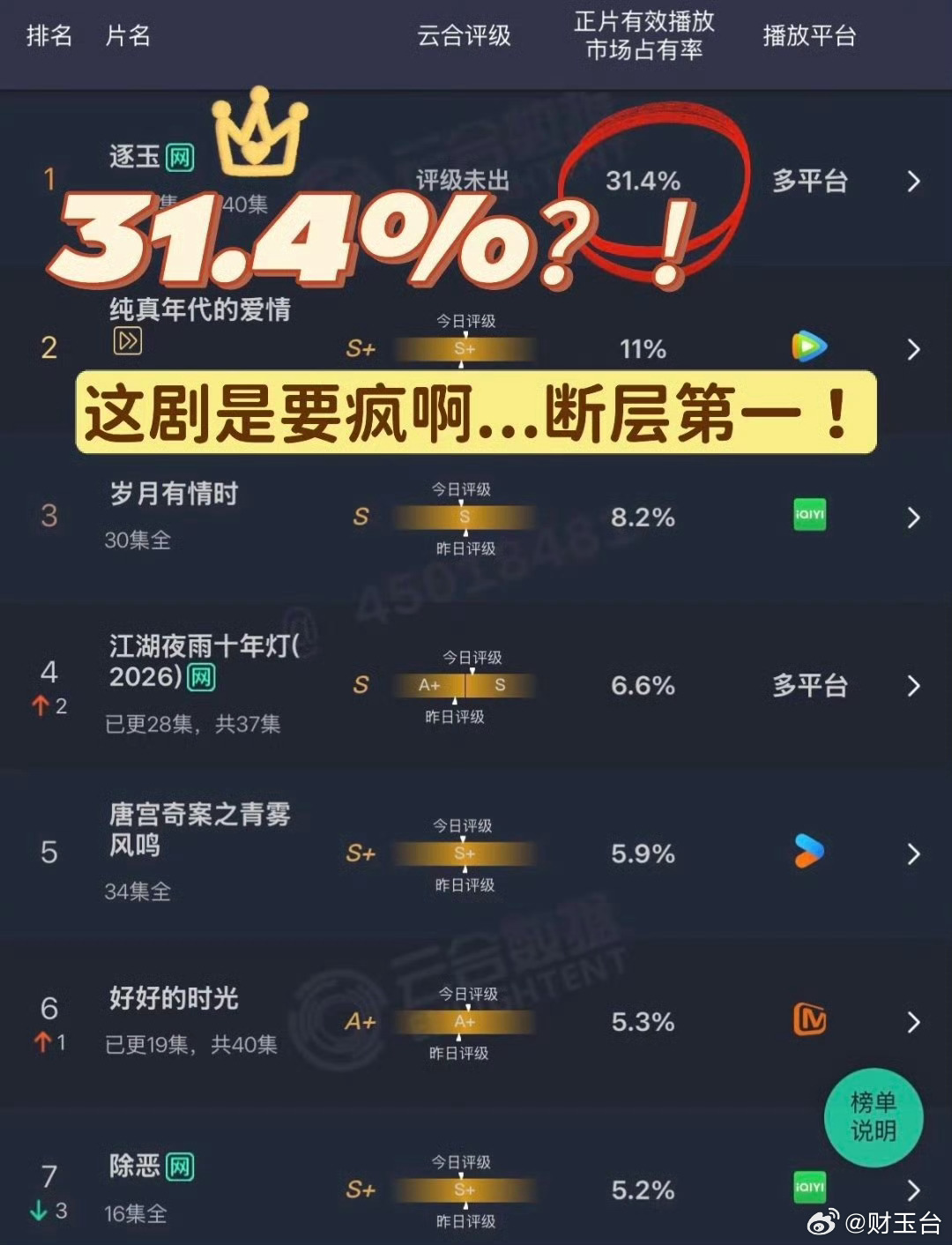骄阳似我 逐玉两部剧赛道、风格完全不同,一个都市现偶治愈成长,一个古装权谋先婚后爱,本来就不是一个赛道,真没必要拉踩吵架。各花入各眼,喜欢甜暖看骄阳,爱爽甜古偶追逐玉,安安静静追剧、尊重不同审美才是最舒服的。好剧靠口碑说话,不比较、不互撕,快乐看剧~