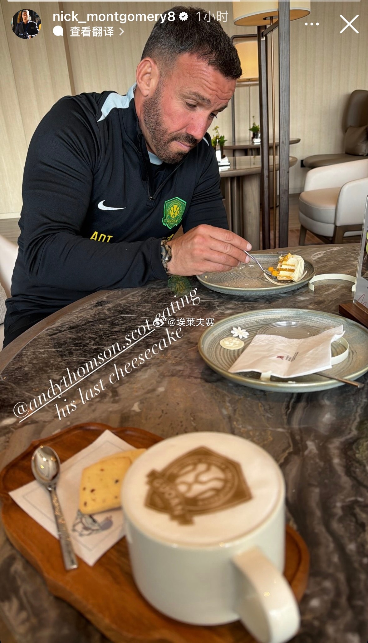 国安主帅蒙哥马利更新社交媒体:“他正在吃最后一块芝士蛋糕”。