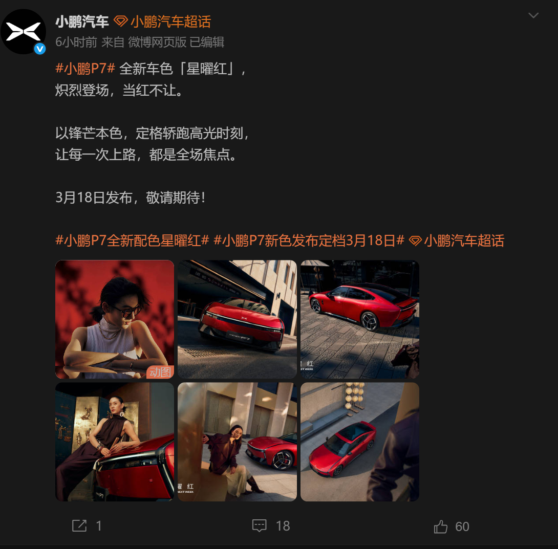 小鹏 P7 全新车色“星曜红”来了