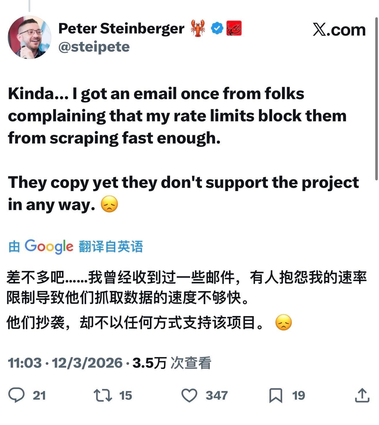 扒的时候还给Openclaw创始人Peter发了封邮件,抱怨对方的速率限制影响了抓取速度