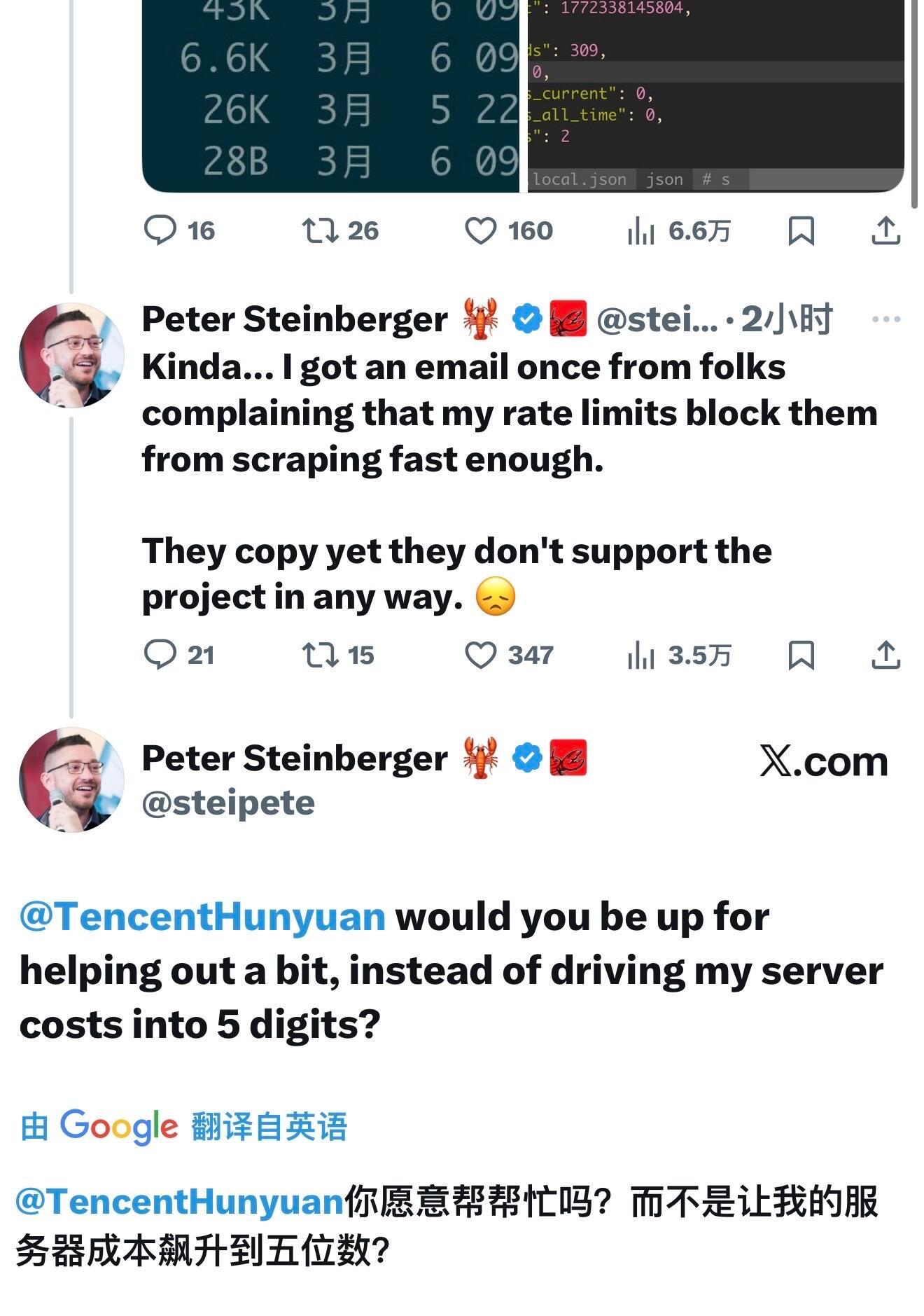 Peter直接艾特腾讯混元社交账号,说你们能支持一点儿吗,而不是把我的服务器成本干到了5位数