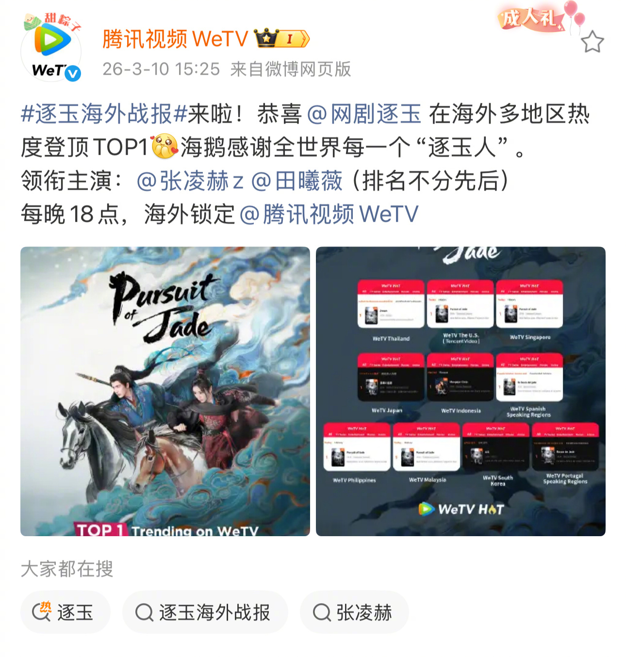 逐玉出海成绩爆火逐玉海外人气 看到鹅的战报,剧粉又火速支棱起来了~管外面纷纷扰扰逐玉独自不停吸粉走起!WeTV第一、网飞新加坡top1、网飞泰国top1、网飞马来西亚top3、网飞韩国top5、网飞日本top10……说实话这些都是剧情质量的印证啊!!我看谁再说逐玉不好看不好嗑!!