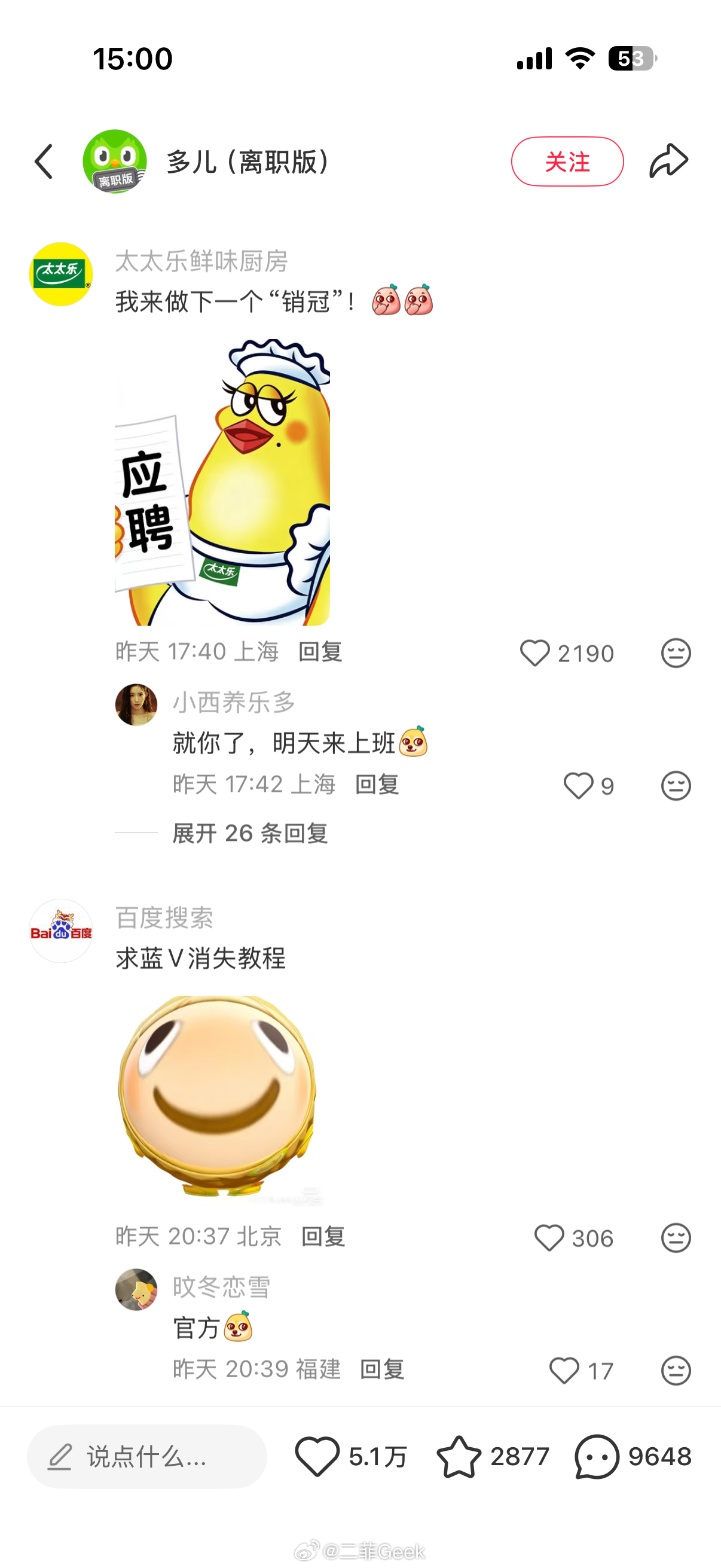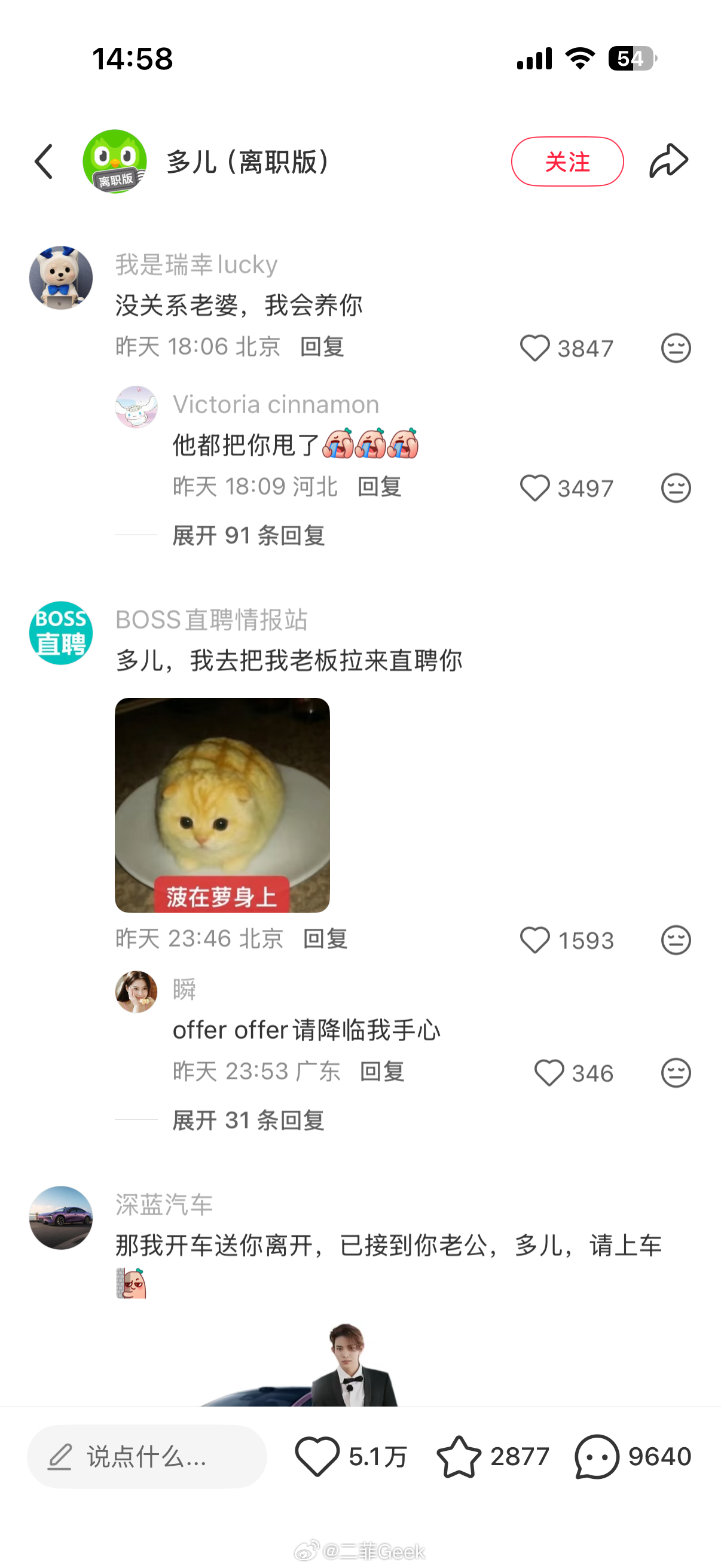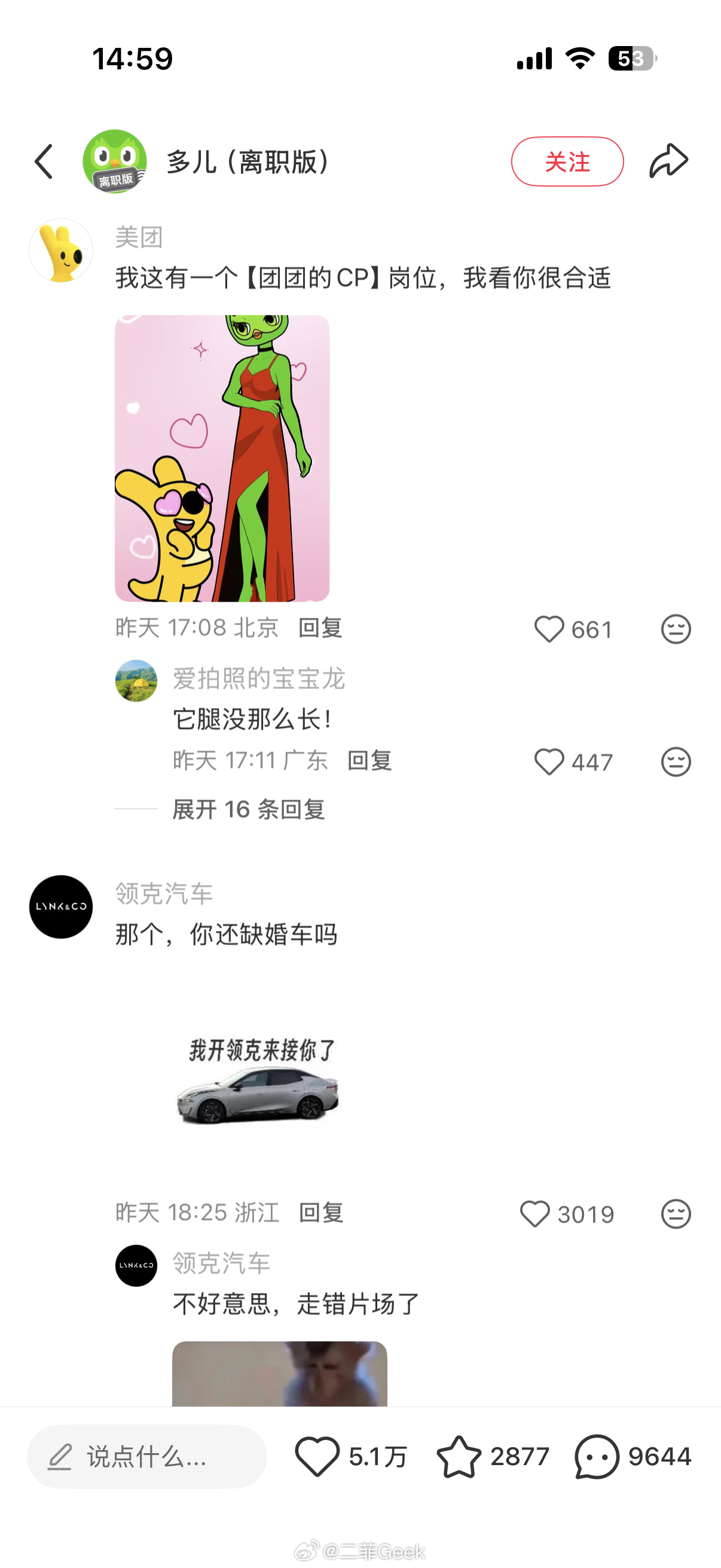 多邻国热度这么高吗绿鸟离职评论区一堆官方账号来添乱心相印、醒图app、百度网盘、瑞幸、深蓝汽车、领克汽车、滴滴顺风车……各个品牌都乱成一锅粥了可以趁热喝了