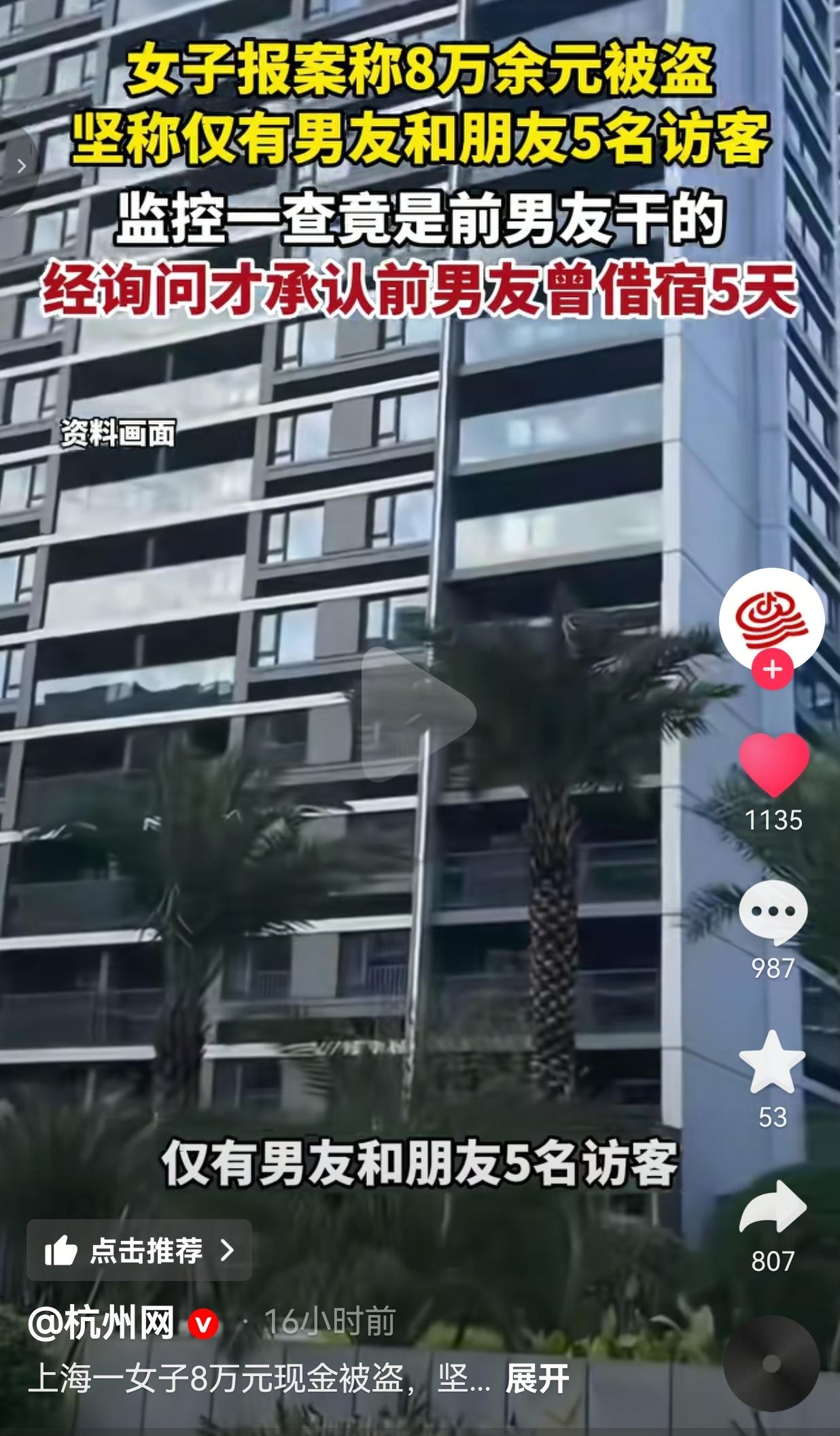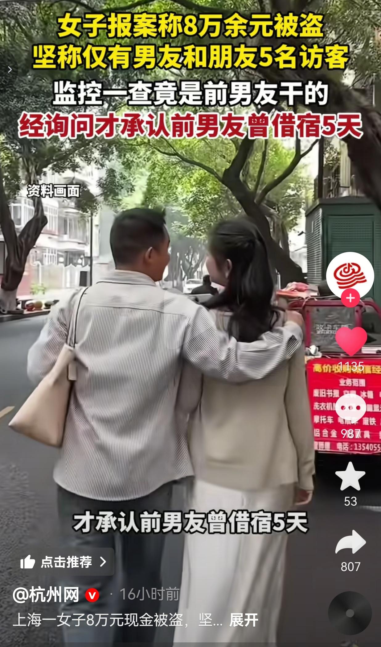 真的是知人知面不知心呐!近日上海一女子发现家里8万多现金不翼而飞,这可不是一笔小数目,如果真的丢了,有点肉疼,因此,在情急之下,她选择了报警。 面对警察的询问,她拍着胸脯保证:“这段时间就我男友和5个朋友来过,绝对没别人!” 结果呢?警察调了监控,顺着线索一查,偷钱的居然是她前男友! 更离谱的是,在铁证面前,女子才吞吞吐吐承认:前男友早就借着“没地方住”的由头,在她家借宿了整整5天!她之前故意瞒着不说,大概是怕现任男友误会,也怕被警察说她隐瞒线索吧? 可她偏偏忘了,钱不会自己长腿跑,家里没被撬锁,门窗完好,熟人作案本来就是板上钉钉的事。 她以为藏住一段旧关系,就能保住体面,最后反而差点耽误了查案,也让自己的钱白白被人卷走。 此事引发热议,有的网友说:“我也是服这女生了,都有现任了还让前任住家里,这不是心软,是拎不清!钱丢了也是给自己上一课。” 也有的网友说:“大额现金放家里,还不藏好,这不等于告诉别人:快来偷我?心太大了!” 还有的网友说:“知人知面不知心,你把他当故人,他把你当钱包,熟人作案最伤人。” 说真的,看完我特别感慨: 首先,钱真的别全放家里!现在移动支付这么方便,大额现金锁家里,既不安全又容易被惦记,这不是给自己找罪受吗? 其次,边界感太重要了!都分手了,还让前任在家住5天?这不是心软,是对自己、对现任、对财产的不负责任。前任要是真有难处,帮他找个酒店、借点钱都可以,但“留宿”这个口子一开,后面的麻烦谁也预料不到。 最后,面对警察别撒谎!女子一开始隐瞒前男友借宿的事,说白了就是想掩盖自己的“小秘密”,可这种隐瞒差点让调查走了弯路。在法律和财产安全面前,那点所谓的“面子”,真的一文不值。 其实,这件事情最让人难以接受的是,偷钱的是曾经最亲近的人。曾经掏心掏肺的恋人,最后变成了伸手偷你积蓄的小偷,这种背叛感,比丢了钱还疼。 所以啊,不管是谈恋爱还是处朋友,识人不清真的会让你付出惨痛代价。 我们总说“害人之心不可有,防人之心不可无”,可真正能做到对所有人都保持警惕的,又有几个? 针对此事,你有什么看法呢?欢迎大家评论区讨论留言。