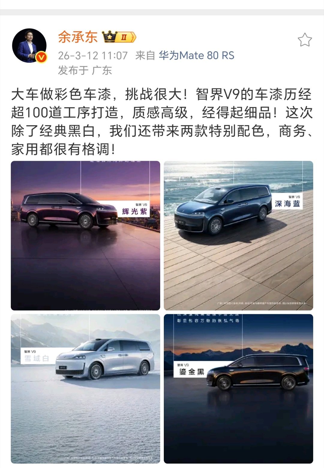 【华为余承东公布鸿蒙智行智界V9车色:辉光紫、深海蓝等】