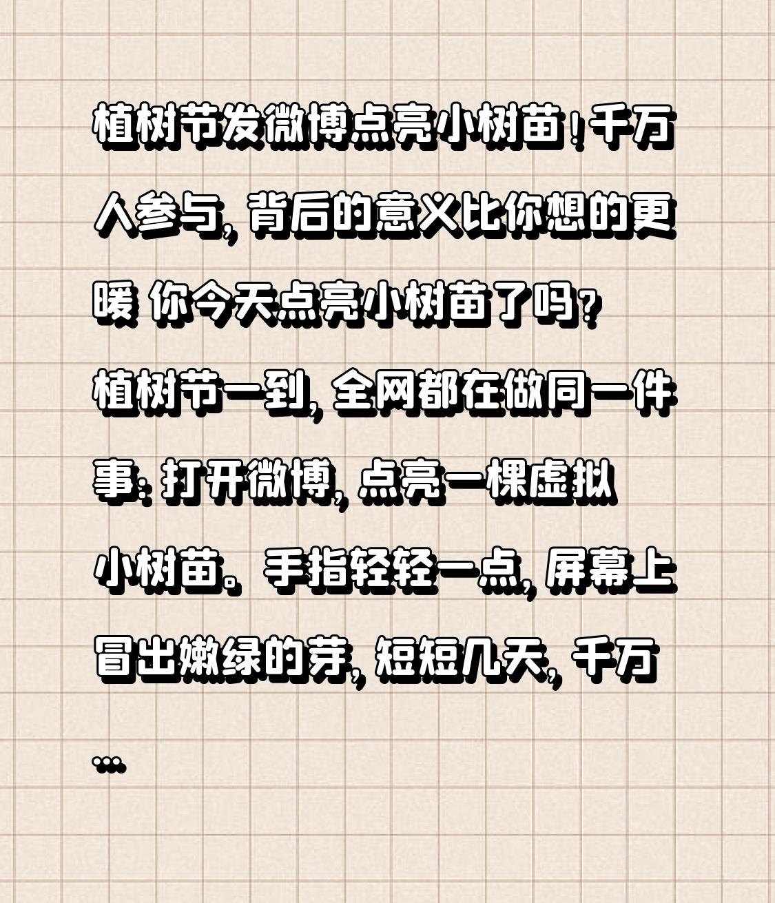 植树节发微博点亮小树苗!千万人参与,背后的意义比你想的更暖 你今天点亮小树苗了吗? 植树节一到,全网都在做同一件事:打开微博,点亮一棵虚拟小树苗。手指轻轻一点,屏幕上冒出嫩绿的芽,短短几天,千万网友参与,满屏都是生机勃勃的绿色。 很多人以为,这就是个简单的线上小游戏,点一点图个热闹。但你知道吗?你点亮的每一棵虚拟树苗,背后都对应着现实里真真切切种下的树! 这不是噱头,是实实在在的公益。平台联合公益组织,网友每点亮一棵,就会在沙漠、荒山、水土流失的地方,种下一棵真树。可能是梭梭,可能是沙棘,可能是侧柏。你在屏幕前的一次随手参与,就为地球添了一抹真实的绿。 本来以为只是凑个节日氛围,没想到转折来了—— 有人说:“我每天都点亮,坚持一年了,没想到真的有树因为我活下来。” 有人晒出自己的“种树证书”,骄傲得像拿到奖状; 还有人带着孩子一起点亮,告诉孩子:“你看,我们也在保护地球。” 更暖的是,很多人从“随手点一点”,变成了“每天必做”。不是为了奖励,不是为了排名,而是慢慢明白:环保从来不是大事,而是每个人的小事。 以前总觉得,种树要去野外,要扛铁锹、挖大坑,离自己很远。现在才发现,环保可以很简单:少用一个塑料袋,节约一杯水,点亮一棵小树苗,都是在为地球出力。 千万人的微光,聚在一起就是一片森林。你点亮的不只是一棵虚拟树苗,更是一份希望,一份责任,一份对未来的温柔。 沙漠会变绿,荒山会发芽,空气会更清新,这一切,都藏在你每一次轻轻的点击里。 植树节不只是一天,而是提醒我们:爱地球,从每一天的小事开始。 今天,你点亮小树苗了吗?一起为绿色地球加油!