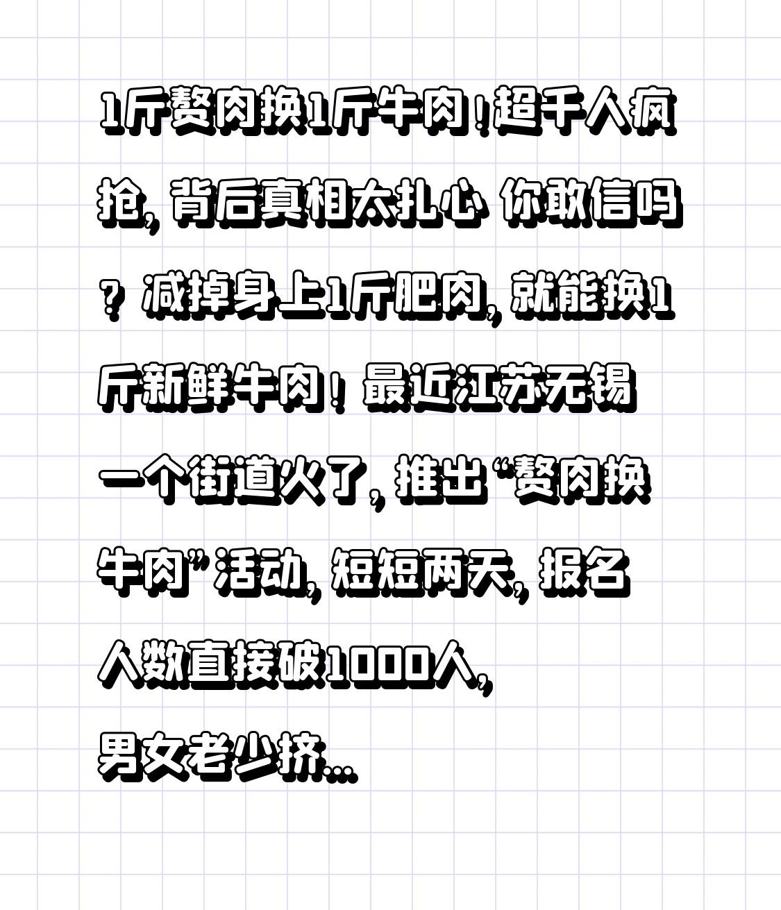 1斤赘肉换1斤牛肉!超千人疯抢,背后真相太扎心 你敢信吗?减掉身上1斤肥肉,就能换1斤新鲜牛肉! 最近江苏无锡一个街道火了,推出“赘肉换牛肉”活动,短短两天,报名人数直接破1000人,男女老少挤破头要参加,网友看完都喊:求全国推广! 到底咋回事?听我给你唠明白。 不是什么商业套路,就是当地街道办搞的健康减重挑战赛,规则简单到离谱:只要你社保在辖区,BMI超标或者腰围不达标,就能报名。减1斤赘肉,换1斤牛肉;减2斤换牛尾,减3斤换牛百叶,多减多得,最多能换20斤,全程不花一分钱,还强调必须科学减肥,不准吃减肥药、不准极端节食,主打一个真诚不坑人。 本来以为就是个普通的社区活动,没想到直接炸了锅。48小时1068人报名,男的比女的还多,大家不是差那点牛肉,是终于有个动力,能把身上的“累赘”换成实实在在的好处。 但转折来了,有人羡慕,也有人扎心。 很多网友留言:刚减了40斤,感觉错过一个亿;还有人说,自己减了一辈子肥,没坚持下来,就缺这一斤牛肉的动力;更有人调侃,减完吃牛肉,吃完再减,无限循环,这不就是双赢吗? 其实大家疯抢的哪里是牛肉,是被生活磨掉的自律,是想健康却总没借口开始的无奈。 现在的人,上班久坐、熬夜外卖,肚子上的肉越来越多,想减肥总喊没时间、没动力,而这一斤牛肉,就成了最接地气的激励。不用讲大道理,不用灌鸡汤,就用一顿家常的牛肉,撬动千万人的健康意识,这才是最聪明的做法。 说到底,我们想要的从来不是那斤牛肉,是瘦下来的自己,是健康的身体,是能好好吃饭、好好生活的底气。 这样的活动,真的该多来点!你愿意为了牛肉减肥吗?评论区聊聊。