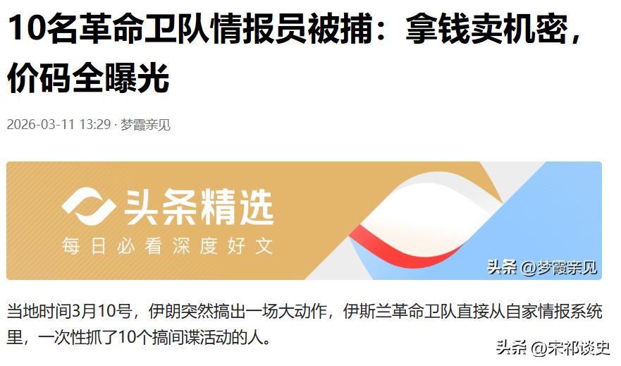 拿命换钱?革命卫队情报员卖机密,5万美金卖核坐标。 从“梦霞亲见”处了解到,当地时间3月10号,伊朗掀起一场狠辣肃谍风暴,伊斯兰革命卫队从自家情报系统里,一次性抓获10名从事间谍活动的核心人员,再加上当天警方、情报部门抓捕的上百人,一场全国性抓内鬼行动彻底铺开。 这些被捕者手握特权,能自由出入军事基地、导弹阵地,本该守护国家机密,却干起了泄密勾当。 最让人寒心的是,这些内鬼泄密全是为了钱。 伊朗受制裁经济紧张,这些情报员月薪仅150美元左右,境外势力趁机开价,基层人员月领5000美元,拍一张军事照片250美元,核设施坐标更是5万美元起步,还有绿卡、留学名额等诱饵。 他们甚至形成流水线泄密,偷偷拍机密、加密传出去,还拉同事下水,导致伊朗军事目标多次被精准盯上。 这场肃谍风暴,是美伊情报战白热化的体现,伊朗下重手既是止损,也是亮态度。 这些内鬼拿国家安全换一时利益,最终只会面临最严厉的惩罚,也给所有人敲响了警钟。