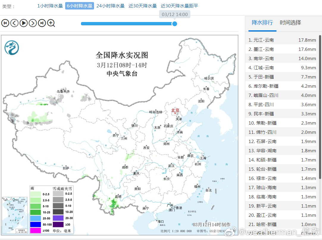 【雨雪增多】今天08-14时,因为冷空气回流,新疆南部多地出现雨雪。同时暖湿气流加强北上,云南四川部分地区降雨开始增多。从云图上可见,冷空气推动的冷锋云系继续东移,暖湿气流主导的降水云系在北上。今天下午到明天中午,冷暖空气交汇,从云南到内蒙古东部、黑龙江西北部,将有大范围雨雪。