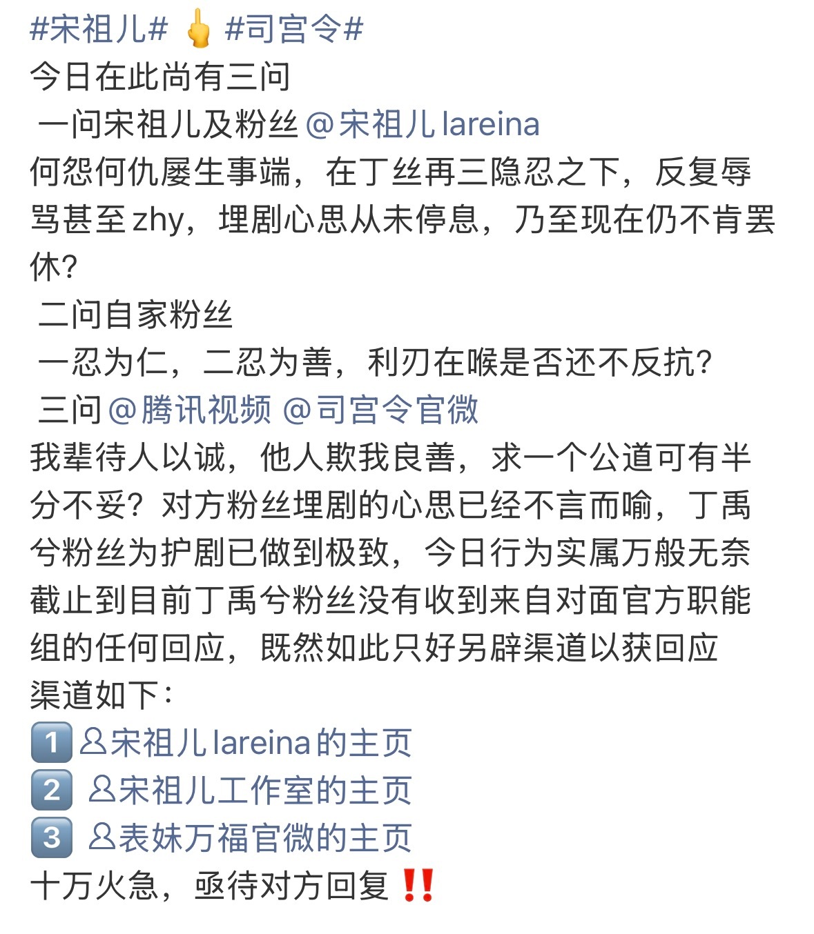 司宫令16号开机,🐧也不算重视,看班底和阵容都很一般,番位更是得battle好久。现在流程已经来到了宋祖儿本人微博评论区被🐰,现在流量花生和和气气合作下来好难哦