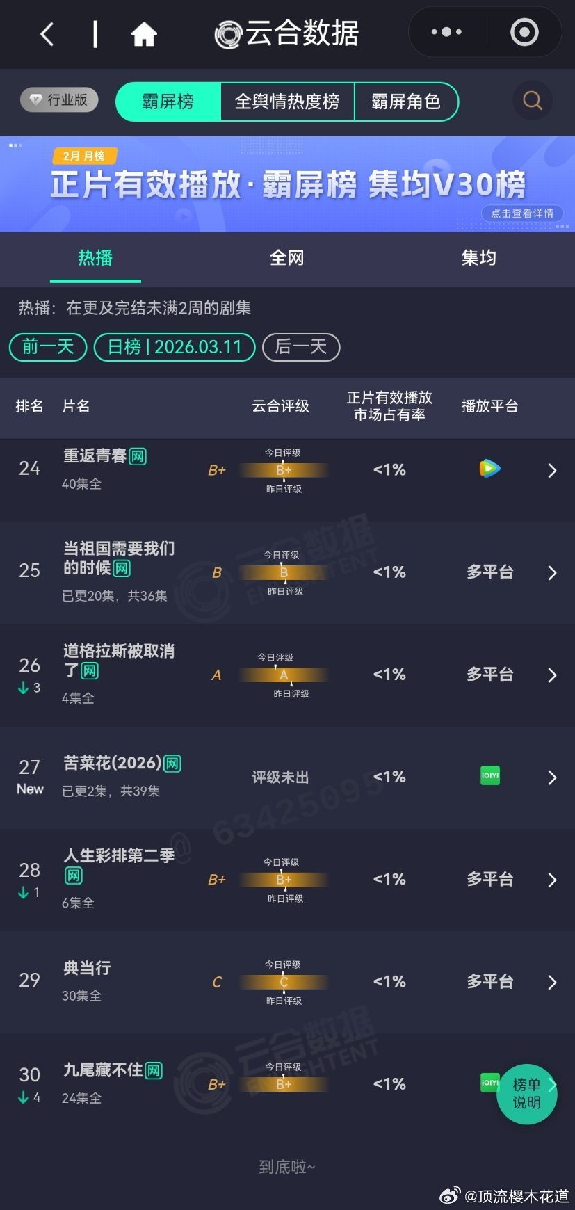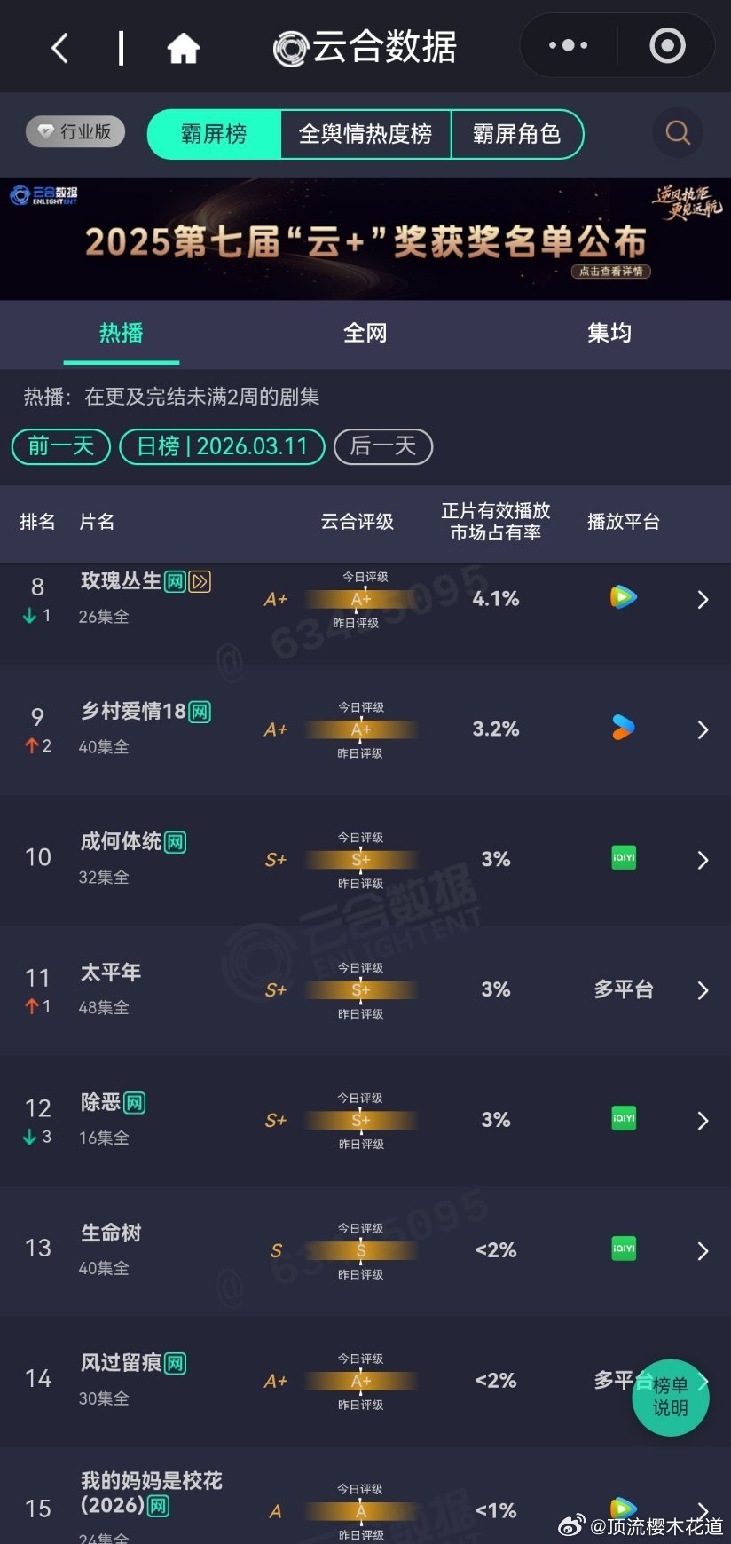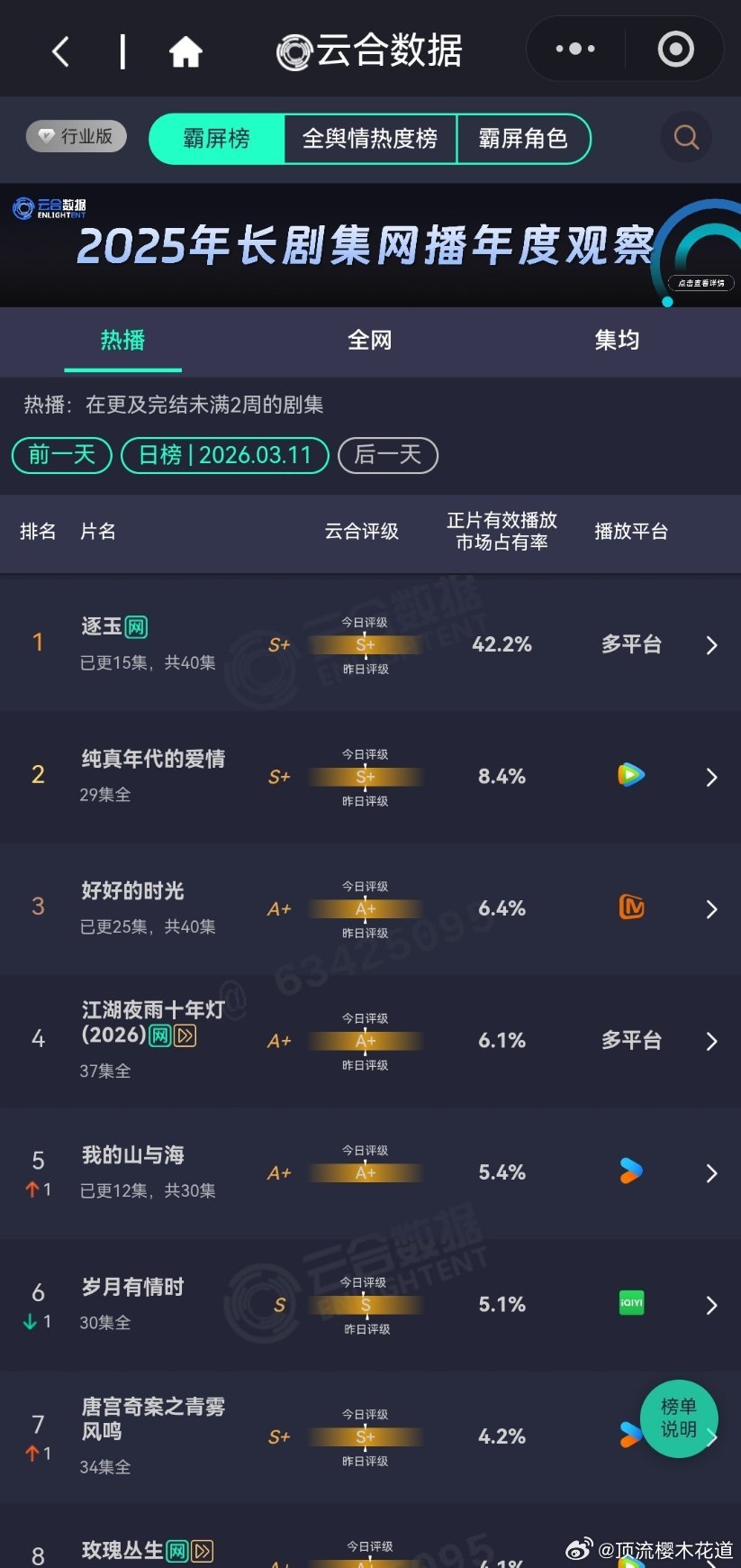 3月11日云合播放占比云合 VS酷云已失去评价这些数据的兴趣,请自行查看,内心各自心里有数。