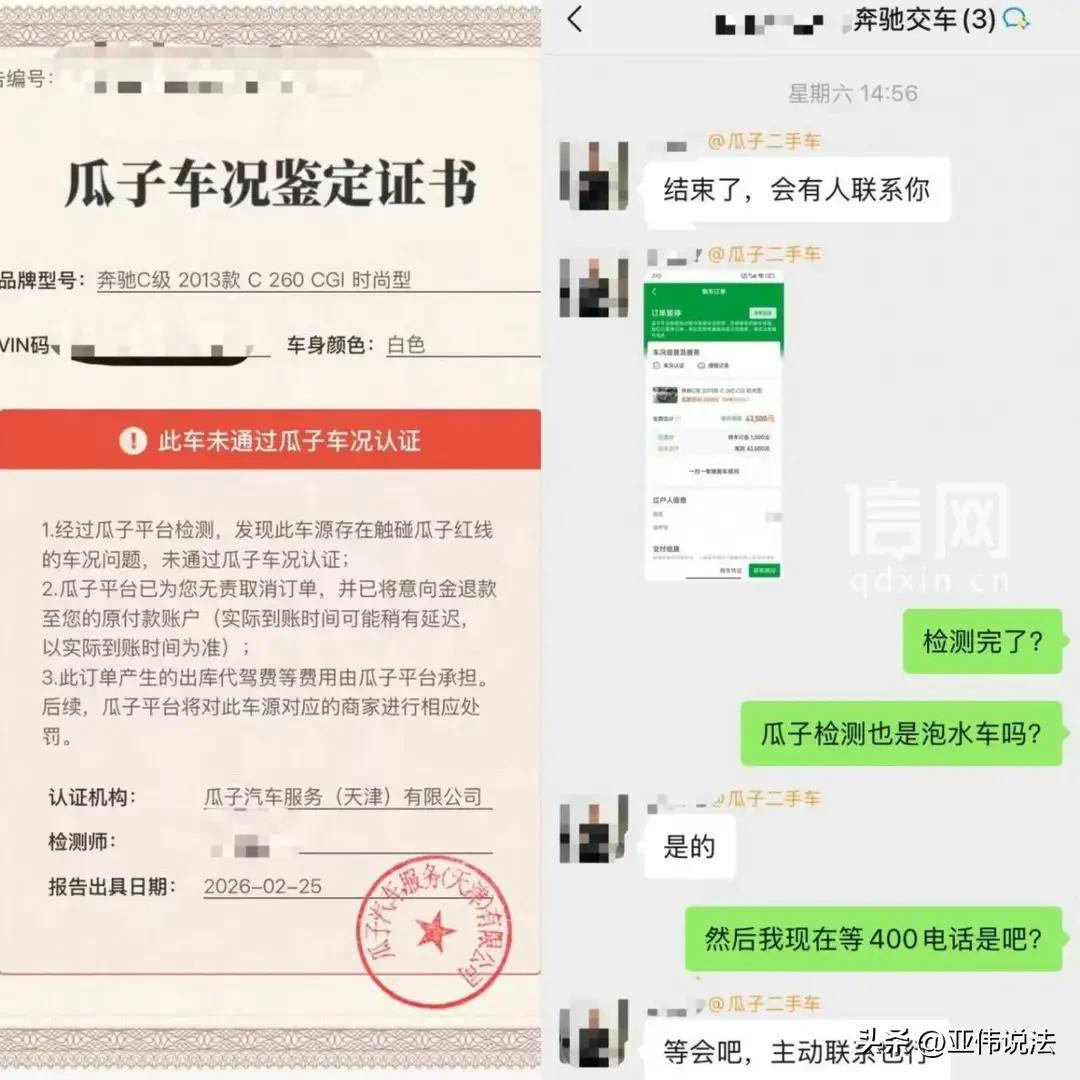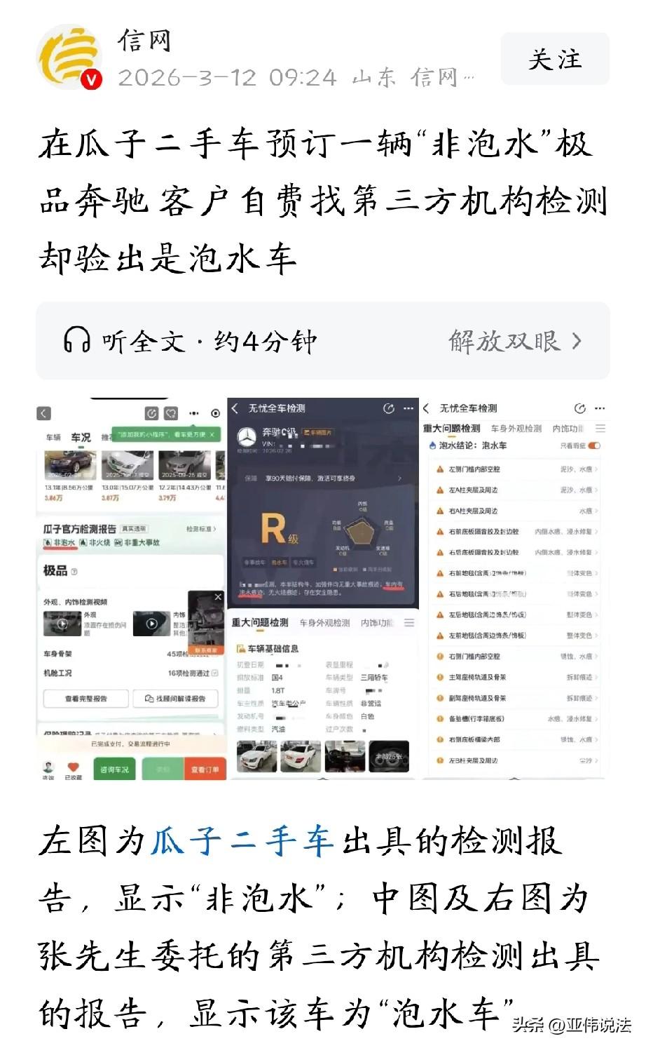 妥妥的诈骗!山东德州,男子在某二手车平台看了一辆13款的奔驰C260,标价4.35万,官方检测报告上写着“非泡水、非火烧、非重大事故”,他觉得性价比挺高,马上付了1000元定金。为了保险,他又花599元找了第三方机构进行检测,谁知,发现这车竟然是辆泡水车。事后,平台承认,复检结果确实是泡水车,但鉴定日期却是自己发现之前。男子怒了,他怀疑平台明知车子有问题,还要卖给他,纯属诈骗,要求赔偿。 今年年初,张先生打算买辆代步车,但因为手头资金有限,他想着先买一辆二手车,性价比更高。 他在某二手车APP上看了很久,2月24日晚上,选中了一辆2013款的奔驰C260,标价4.35万,十年车龄。 他点开平台出具的官方检测报告,上面清清楚楚写着“非泡水、非火烧、非重大事故”,几个大红字跟盖章似的,看着就让人放心。 心动归心动,但毕竟好几万块钱的事,他还是留了个心眼。 第二天他给平台售前打了个电话,工作人员信誓旦旦的承诺,说车子支持任何正规第三方检测,他们那么大的平台,让他放心。 这话听着硬气,张先生心里踏实了不少,决定先把车定下来。 他付了1000块钱的锁车订金,又自己花了599元,从网上找了家第三方检测机构,约好等车到了就验。 他想的是,两边都验验,没问题再付尾款,多花几百块买个安心。 2月26日,二手车的业务员开着那辆奔驰,接上张先生一块去了第三方检测点。 到了检测点,第三方的人拿着仪器出来忙活。本想着检测一过,车就是自己的了,万万没想到,出岔子了。 检测大概过了二十分钟,工作人员走过来,压低声音表示,这车地板底下有水渍痕迹,线路接口也有锈蚀,很可能是泡水车。 说着把一张单子递过来,上面标注着几处异常。 张先生当时脑子嗡的一下,整个人都愣了,这要是泡水车,开回去三天两头出毛病不说,安全都是问题。 务员见状,没有狡辩,只说他先把先开回去,让平台复检一下。 接下来的几天,张先生心里一直七上八下,想着是不是第三方验错了,希望平台复检能翻盘。 2月28日下午,他实在坐不住了,主动给瓜子客服打电话。 工作人员表示,那辆车复检结果出来了,确实是泡水车,过不了平台认证,订单给他取消,将订金退回去。 本来觉得客服态度挺好,既然自己也没有损失,退了就退了。 随后,工作人员发来《车况鉴定证书》,上面白纸黑字,清清楚楚写着这车没通过认证,但他万万没想到,落款日期竟然是2月25日。 他傻眼了,自己26号才找第三方检测的,原来,他们早就知道车子有问题,还是瞒着自己,准备浑水摸鱼。 那如果自己选择相信他们,没有找人检测,那已经付了钱,将这辆泡水车买回家了,钱花了是一方面,这是在拿自己的生命开玩笑呀。 这是妥妥的诈骗,为了钱,真是什么伤天害理的事都干得出来。 张先生越想越来气,找到工作人员要求赔偿。 对方解释,说可能是系统问题,也可能是复检师选错了日期,车既然出了问题,他们该退退,该赔的赔。 第二天,1000块钱定金便退到了张先生的账户里,可接下来补偿的事儿,让他又生了一肚子气。 客服说补偿他200块钱的购车优惠券,30天内有效。 张先生一听就火了,搞欺诈就这种态度?那599检测费和自己来回折腾的路费谁出? 经过多次协商,最后平台赔了他1000块钱,算是检测费和交通费。 事情虽然结束了,但张先生想起来还是后怕,得亏自己当时多了个心眼,掏钱验了一道。 要是我真信了平台那份报告,直接把车开回家,指不定哪天就出事,毕竟泡水车电路说坏就坏,开着开着熄火,太吓人了。 张先生也挺纳闷,那么大的平台,第一次检测为什么就没查出来问题?是查得不仔细,还是刻意隐瞒呢? 对此,平台始终没给出个合理解释。 《消费者权益保护法》第55条规定:经营者提供商品或者服务有欺诈行为的,应当按照消费者的要求增加赔偿其受到的损失,增加赔偿的金额为消费者购买商品的价款或者接受服务的费用的三倍。 平台以“非泡水、非火烧、非重大事故”的检测报告招揽交易,却在交易前已通过复检确认车辆为泡水车,其未如实告知、故意隐瞒关键车况的行为,构成欺诈。 张先生可要求平台退还定金、赔偿第三方检测费等实际损失,并主张三倍的惩罚性赔偿。 二手车水很深,一般人尽量不要碰,如果要买,一定要多张个心眼,防止被坑。