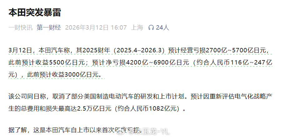 本田的亏损也有点出人意料,主要是考虑电动化战略调整要减去1000亿,这损失大了