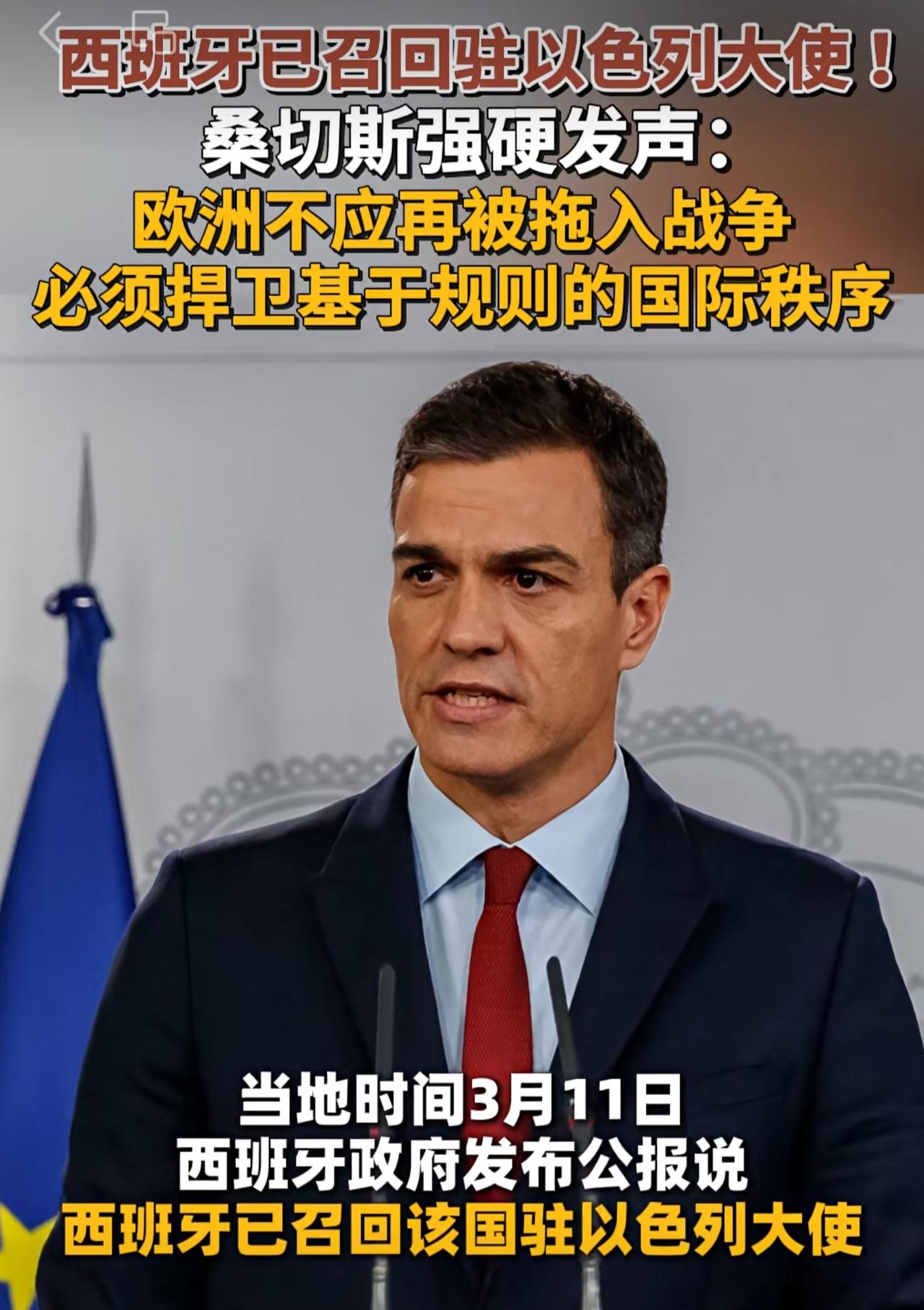 当欧美国家都在对以色列无条件偏袒的时候,西班牙堪称一股清流。西班牙政府发布公报,西班牙驻以色列大使的职务已被解除,西班牙与以色列的外交关系降至临时代办级别。而在去年9月,西班牙就因为武器禁运问题,与以色列矛盾升级,召回了驻以色列大使。敢于坚持正义,这样的国家值得所有人尊重。