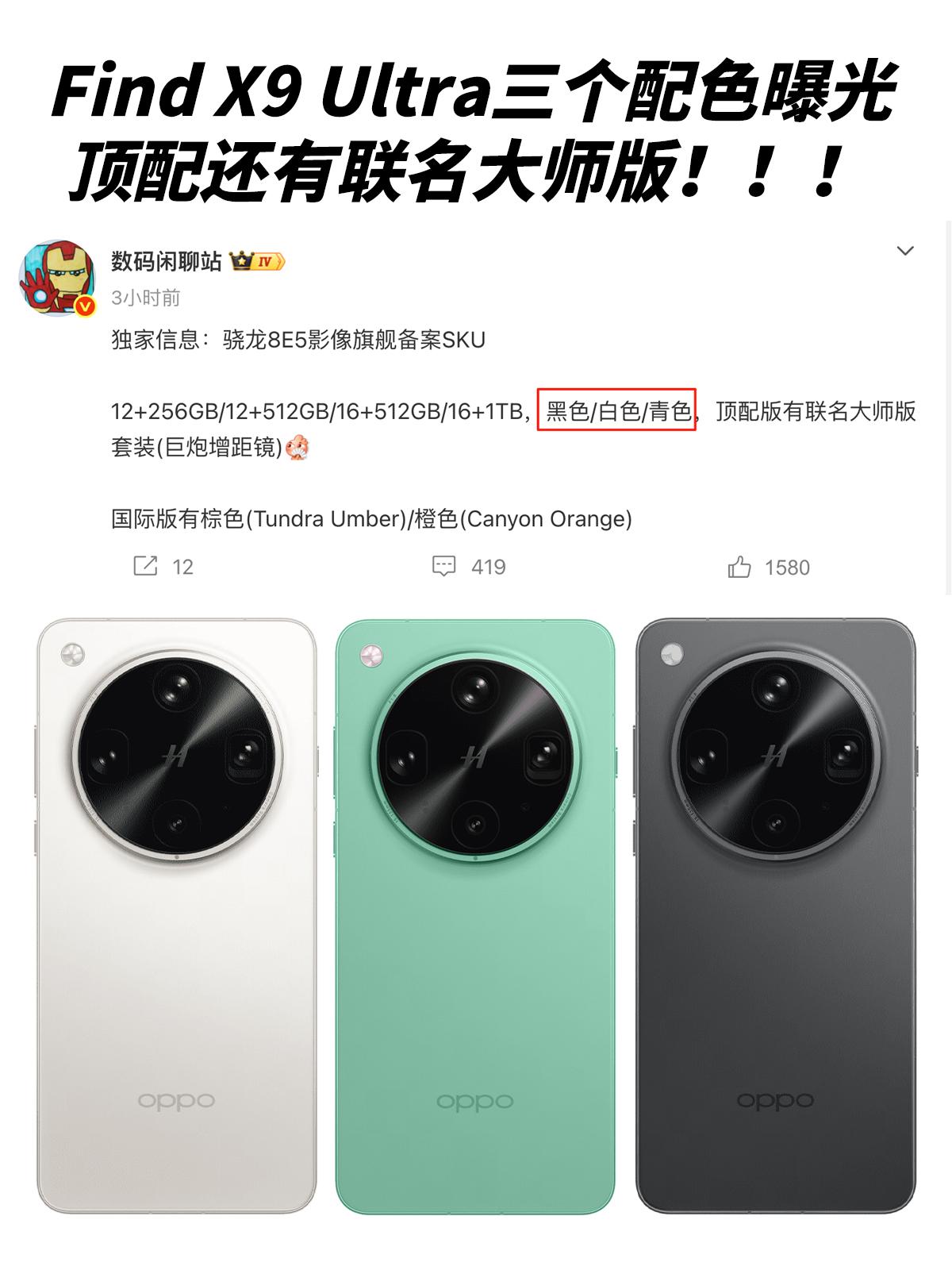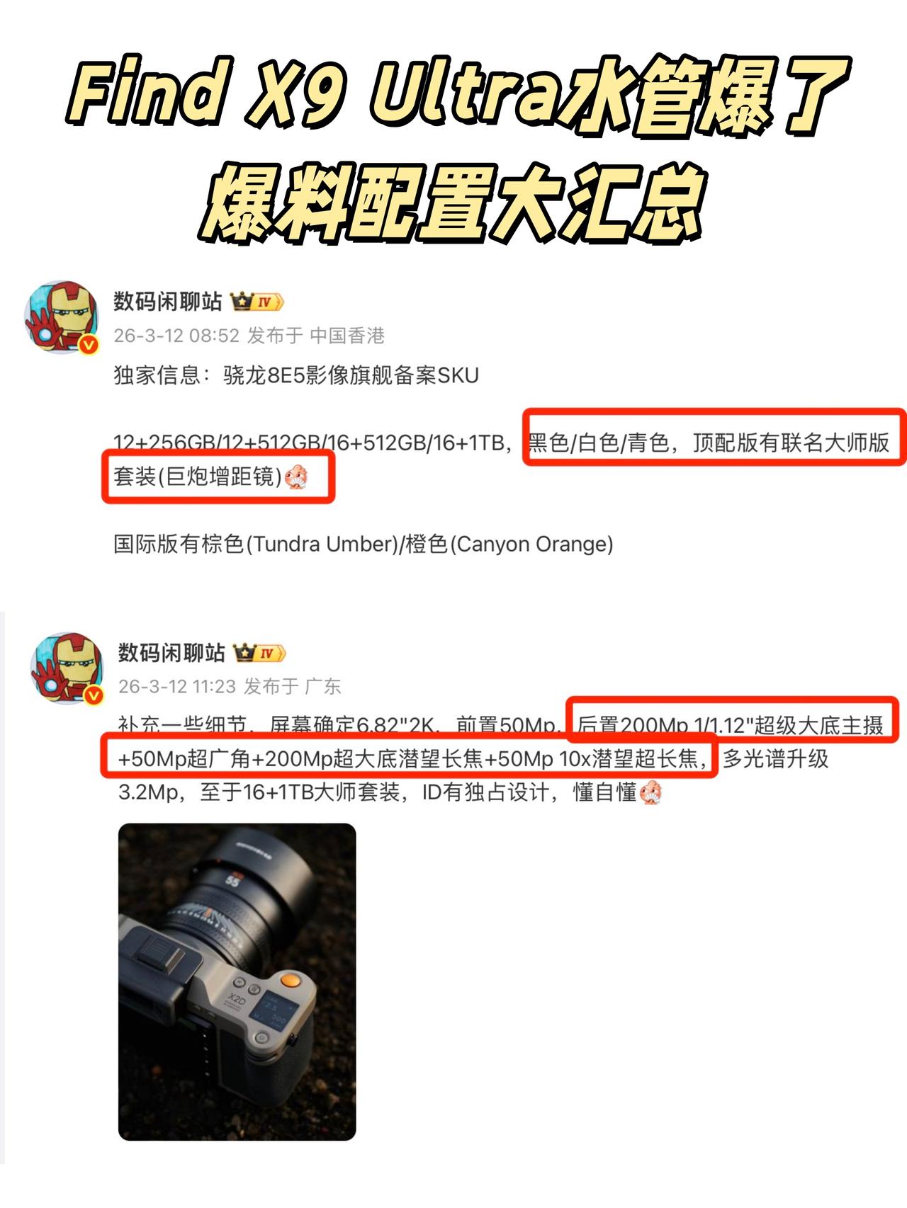 Find X9 Ultra爆水管了‼️我选青色 救命‼️Find X9 Ultra这回是直接爆水管了 各种消息大漏特漏啊...... 看看到新爆料,OPPO这次有点狠啊👆 📱配色有黑色、白色、青色三款 新加的青色看渲染图就好看👍 是按照X8U爆改的,喜欢小清新满满的那个青色... - 📷影像这块,Find X9 Ultra全焦段都是硬核镜头 2亿像素+1/1.12英寸超级大底主摄 还有2亿超大底潜望+ 50MP 10倍光变超长焦 3倍人像+10倍超长焦全覆盖 远近都能拍清,这波堆料不玩虚的 再配上物理外挂——巨炮增距镜 长焦再放大N倍画质不垮 以后我去演唱会带这个应该不错🔭 💾听说这次Find X9 Ultra还有一个16+1TB大师版套装 大内存+专业配件,这是为专业摄影发烧友准备的? 🤔Find X9 Ultra水管上大爆特爆了 拍照堆料猛的很,这影像配置真夸张... 就是不知道💰价格咋样? 毕竟现在大环境都在涨,Find X9 Ultra还有1TB版本,能稳住吗? 数码爱好者OPPO Find X9 Ultra