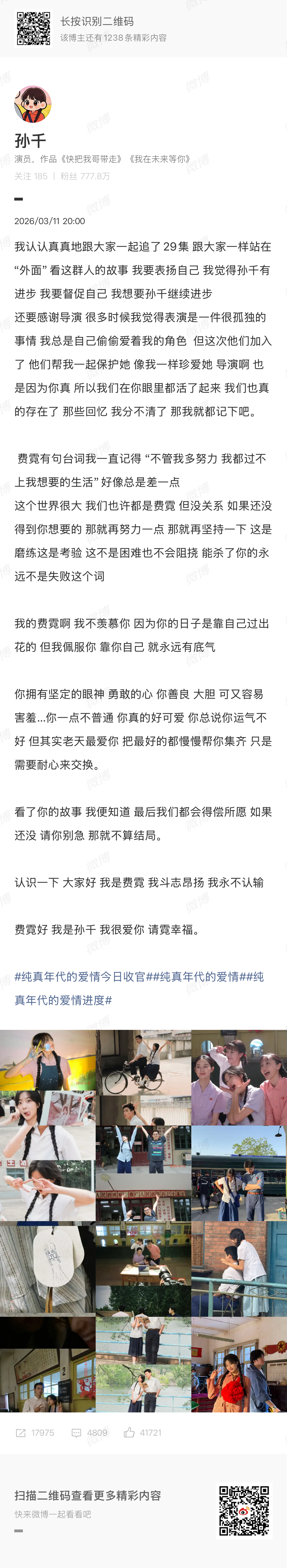 孙千收官文感谢导演孙千是靠自己过出花的《好好的时光》圆满收官啦✨孙千发文谢谢导演,谢谢所有台前幕后的伙伴,也谢谢温柔又勇敢的费霓。人生没有标准答案,靠自己,也能把日子过得热气腾腾、开出花来。未来继续前行,不负每一段相遇❤️