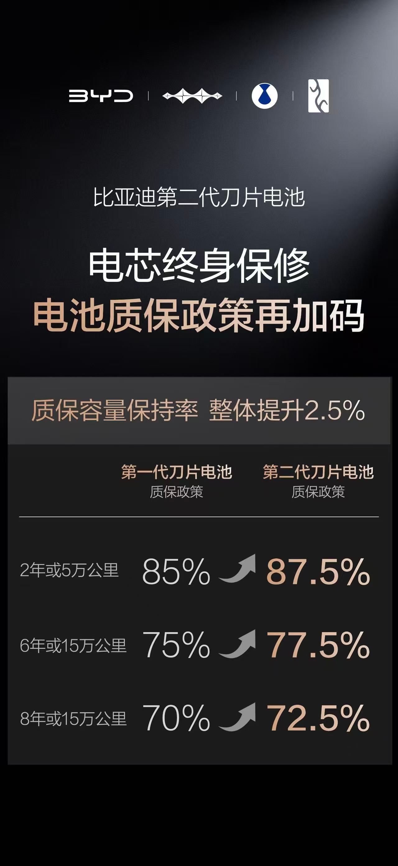 比亚迪第二代刀片电池的补能技术,可谓是新能源汽车领域的引领者。在电池安全方面,比亚迪更是下足了功夫。首先,在第二代刀片电池上突破技术瓶颈,创新性打造锂离子高速通道,大幅提升锂离子传输效率;配合全温域智能热管理系统,让闪充过程尽量减少发热,同时让热量更快、更均匀地散发出去。其次,电池经过500次边闪充边针刺、底部撞击和四极电磁短路试验,依然做到了不起火、不爆炸,表现十分可靠。最后是比亚迪给到用户的保障:电芯终身保修,质保容量保持率整体提升2.5%。无论是2年或5万公里,还是8年或15万公里,只要容量低于标准,即可享受包换服务。这不仅为用户带来了更严苛的保障,更重新定义电池安全标杆!
