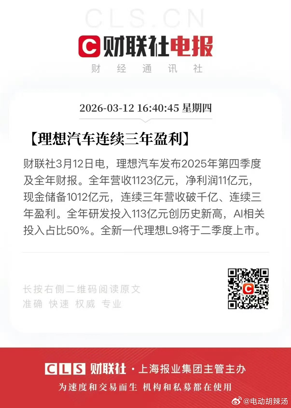 ✅ 理想全年营收1123亿元,净利润11亿元,连续三年盈利!