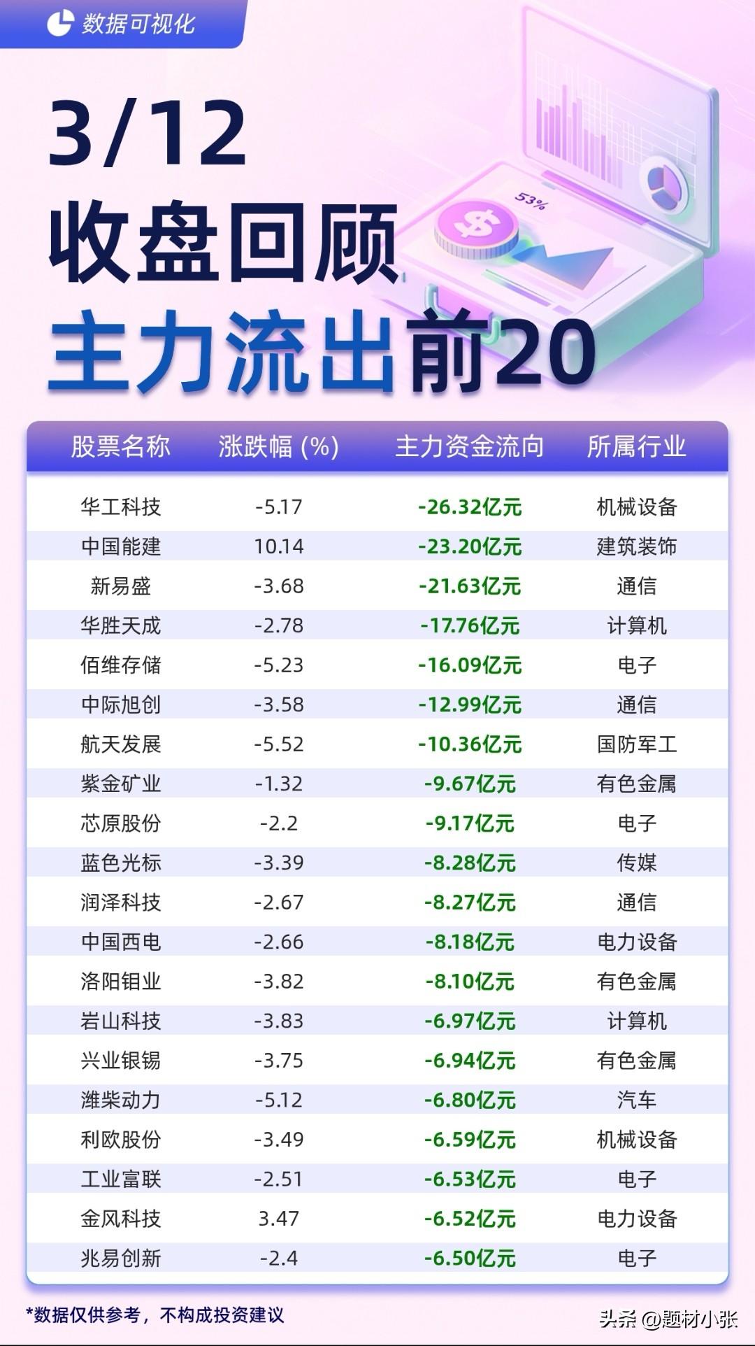 3月12日A股资金动向复盘: 主力资金聚焦电子、有色、计算机及电力设备赛道,三安光电获13.64亿元净流入居首,中国铝业、紫光股份等个股同步获大额资金加仓。 与此同时,机械设备、通信、计算机板块遭资金撤离,华工科技、中国能建分别净流出超26亿、23亿,板块轮动加剧,高低切换特征明显,需警惕高位股回调风险,关注资金持续流入的低位主线机会。 数据仅供参考,不构成投资建议