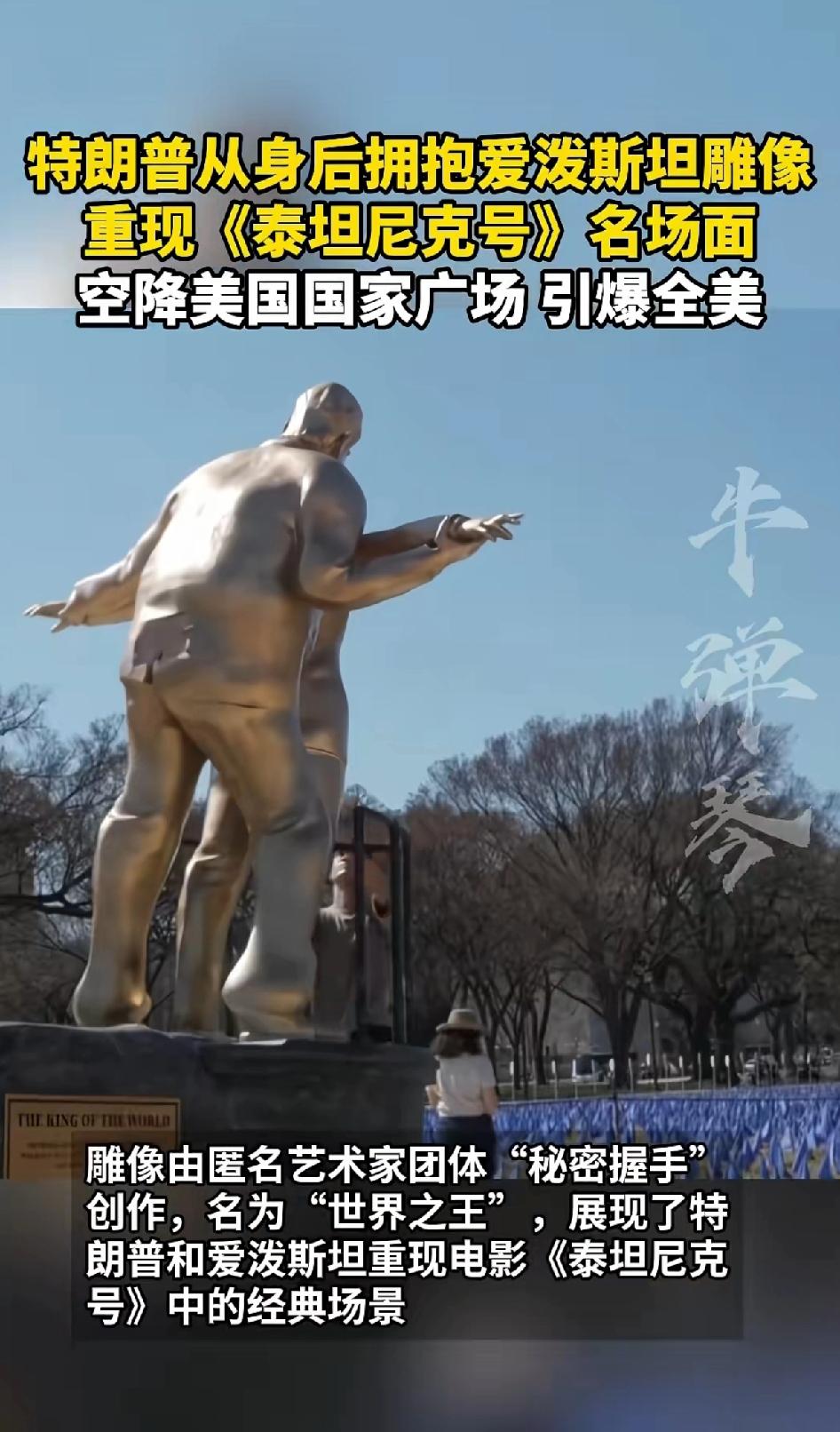 特朗普从身后拥抱爱泼斯坦雕像 重现《泰坦尼克号》名场面,空降美国国家广场,引爆全