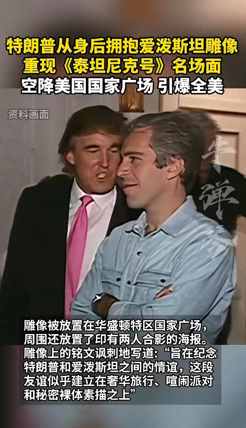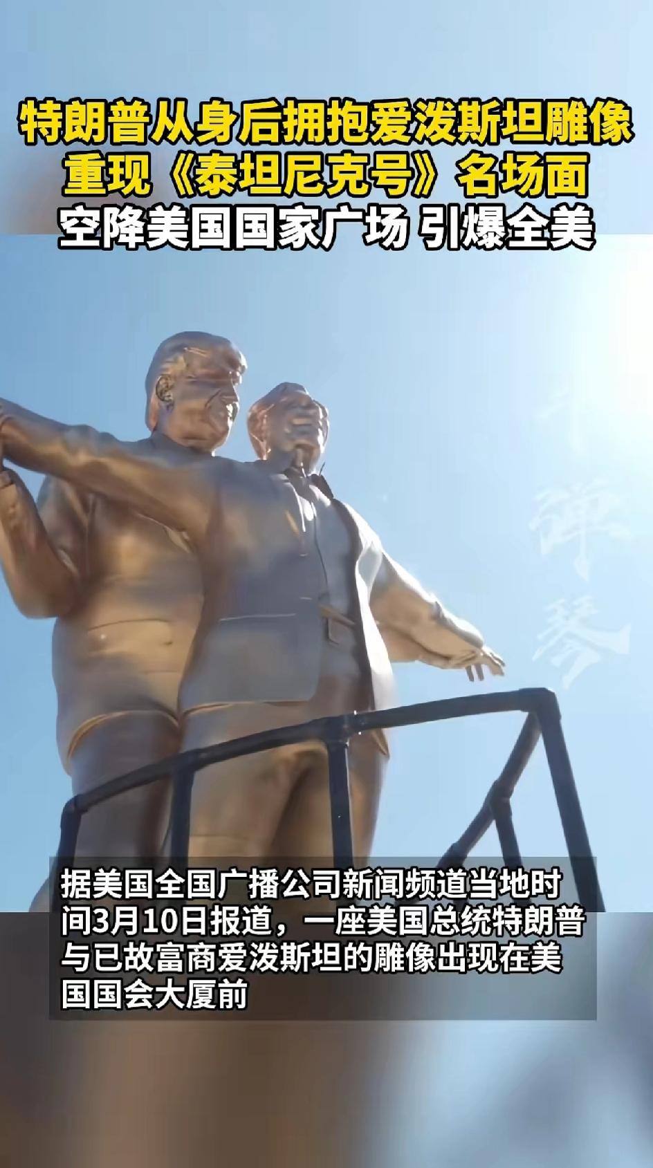 特朗普从身后拥抱爱泼斯坦雕像 重现《泰坦尼克号》名场面,空降美国国家广场,引爆全美。 特朗普这操作真是太会整活了!之前他就有从背后拥抱美职棒球员的事儿,当时很多人就想起了《泰坦尼克号》经典场景。 2019年美职棒新科冠军华盛顿国民队造访白宫,表现出色的日裔捕手库尔特·铃木清戴了“让美国再次伟大”的红帽子,特朗普看到后兴奋得不行,邀请他上前,然后从背后热情拥抱。 现在又来个从身后拥抱爱泼斯坦雕像重现《泰坦尼克号》名场面,还空降美国国家广场,这简直是把话题度拉满,瞬间引爆全美,不知道后续还会有啥更惊人的事儿呢。 美国试图用攻打伊朗的国策来掩盖上层领导人的丑闻,战争还没结束萝莉岛的丑闻又被翻出来。 看来背后的利益牵扯太大,有人想翻篇,有人坚持揭露真相。 战争结束萝莉岛的内幕慢慢揭开。