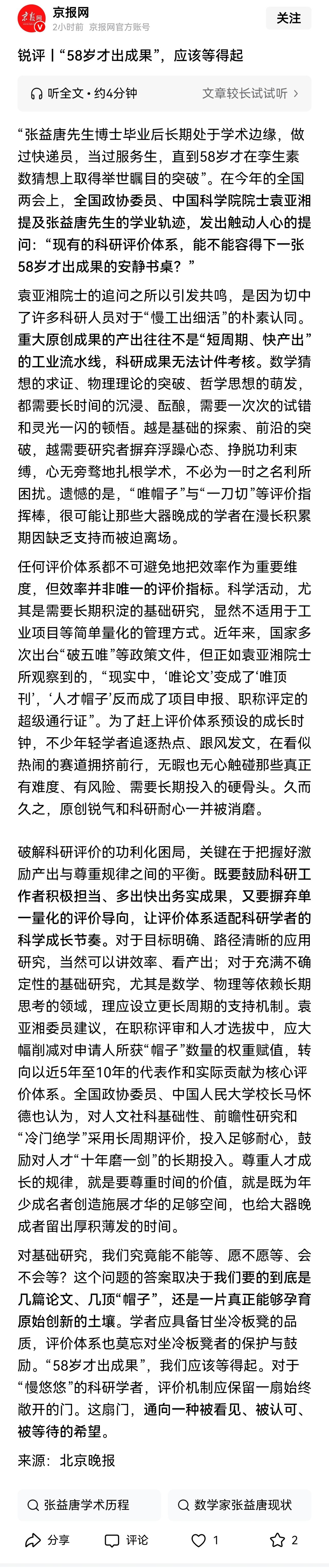 不要说58岁出成果,就是35岁出成果,很多高校、科研机构都等不起。张益唐在出成果之前,可以说“半生潦倒”,据报道,从1991年博士毕业到1999年在新罕布什尔大学担任临时讲师,这之间的八年,张益唐与普渡大学的导师不欢而散,没有拿到推荐信,也没能找到一份可以接纳自己的教职,甚至在他的北大化学系校友在肯塔基州开的赛百味加盟店当过会计。他的经历,说明两点,一是个体要努力坚持自己的梦想,百折不饶;二是学术评价不能急功近利。