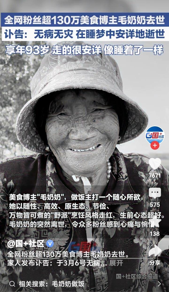 93岁“野派厨神”毛奶奶睡梦中仙逝!一块万能抹布、一锅乱炖江湖,治愈百万网友的“粗糙哲学” (来源:根据“毛奶奶的毛孩子毛毛”账号讣告及全网平台粉丝讨论综合整理) 当全网还在回味那块“万能抹布”擦过食材的随性瞬间,那位93岁的“野派厨神”毛奶奶,已在3月6日的一个寻常夜晚,无病无灾,如睡着般安详告别了她烟火缭绕的厨房。消息传来,百万粉丝心头一颤,仿佛记忆里那口“万物皆可煮”的大锅,骤然熄了最旺的那簇人间烟火。 她的走红,堪称短视频里的一股“泥石流”。没有精致摆盘,没有精准克数,毛奶奶的厨房法则只有一条:顺手。食材或许不刻意清洗,用抹布一擦了事;调料随手一撒,食材“哐当”入锅。这种被网友戏称为“随性、高效、原生态”的“野派”烹饪,却意外地戳中了时代脉搏。在滤镜与标准化教程充斥眼球的今天,毛奶奶的“粗糙”,反而成了最稀缺的“真实”。 我们怀念的,何止是一道菜?更是那份被我们弄丢的生活底气。看她做饭,你会想起自家外婆——不讲究章法,却总能变出温暖滋味。她手中那块“饱经风霜”的抹布,擦去的仿佛是现代人对于生活的过度焦虑与矫饰。她的锅铲挥舞间,是一种历经近世纪风雨后,对生活本质的坦然与掌控:日子嘛,哪有那么多条条框框,熟了、能吃、开心就好。 她的离世,评论区没有太多悲恸,反而涌动着一种奇特的温暖与羡慕。“无病无灾,寿终正寝”,这八个字成了最高频的祝福。在普遍焦虑健康与终老方式的当下,毛奶奶的谢幕方式,成了无数人心中“最理想的告别”。这何尝不是她用一生践行“野派哲学”后,生命给予她的、最圆满的收官? 翻看她的视频,你总能被那张布满皱纹却无比安详的笑脸打动。九十三年光阴,沉淀下的不是沧桑,而是通透的乐观。她的烹饪,从来不只是为了果腹,更像是一场与生活和解的仪式。每一道“粗犷”的菜肴里,都炖煮着“知足常乐”的人生智慧。这或许是她留给粉丝,比菜谱更珍贵的遗产。 我们告别一位博主,更像在告别一个时代符号。她代表了一种即将逝去的、充满手工痕迹和人性温度的生活样态。在效率至上的今天,她那“不干不净,吃了没病”的洒脱,成了一曲复古的田园牧歌,慰藉着无数被“标准化”捆绑的现代灵魂。她的灶台熄火了,但那股自在的生活气息,已留在百万人心间。 毛奶奶走了,但互联网的记忆里,永远会有一位老太太,用最“不讲究”的方式,做着最“讲究”的事——认真而快乐地生活。她让我们看到,生命的厚度与长度,最终会沉淀为一种从容的力量。这种力量,能让我们在纷繁世界里,找到属于自己的那口“安心之锅”。 她的故事,始于一块抹布,终于一场安眠。其间流淌的,是93年不加滤镜的人生。我们致敬毛奶奶,或许也是在致敬我们内心渴望却日渐疏远的那种生活:简单,直接,热气腾腾,充满人的味道。 人间烟火 生命哲学