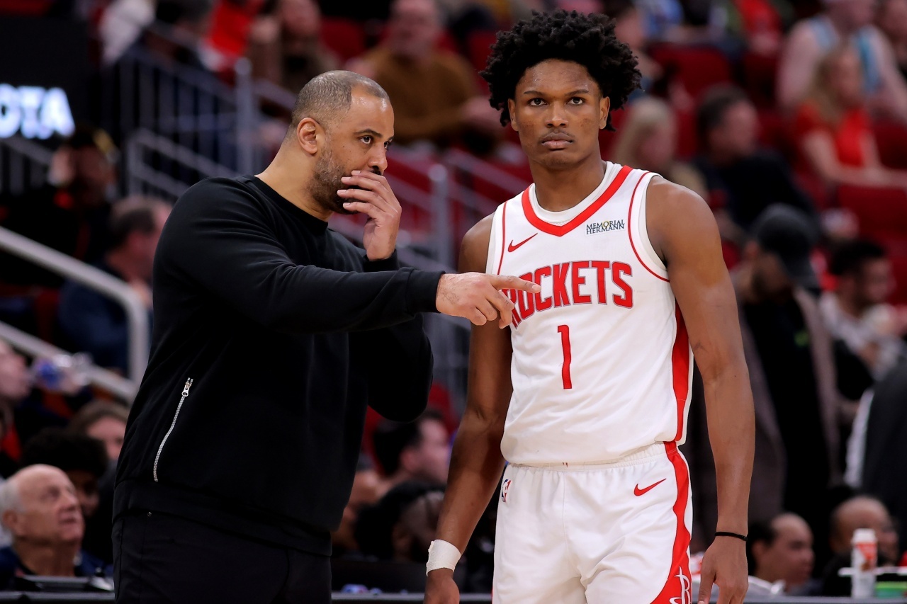 火箭暂时的阵容配置只能把杜兰特当进攻发起点用,原因大家都懂,范弗里特赛季报销,火箭没有首发级别控卫能让杜兰特在甜点位接球。换言之,火箭依赖杜兰特给队友创造空位得分机会,球队不具备让杜兰特扮演终结点的发牌配置。