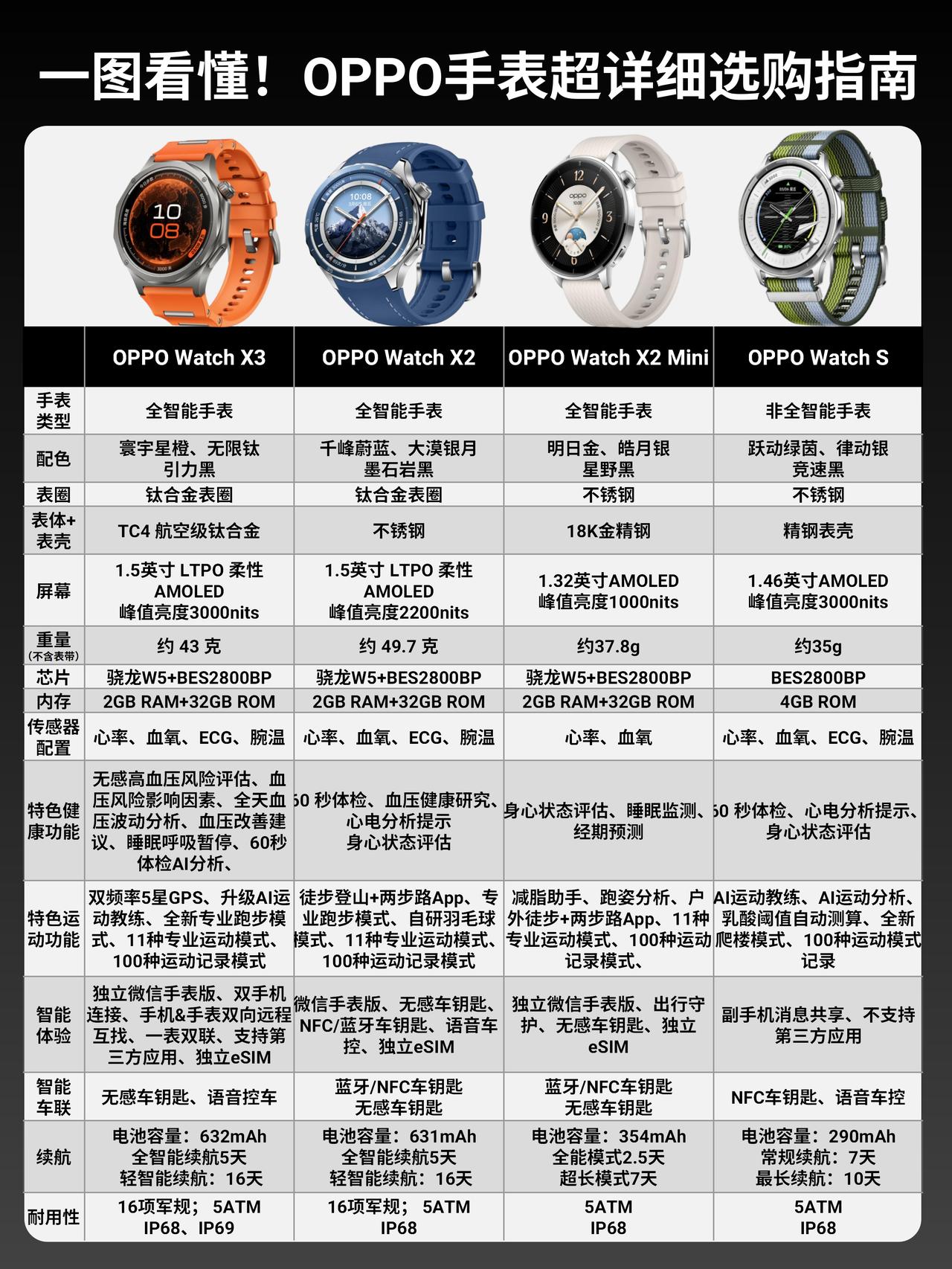 四款OPPO手表怎么选❓X3🆚X2🆚X2mini🆚S 新款OPPO Watch X3来了,想买手表的选择又多了一个! 对比X3、X2、X2 Mini、S这四款手表⌚️哪款更值得入手,一篇给你讲明白咯~ ⭕OPPO Watch X3 最新款全智能手表,X3这次升级很多,全钛材质表体质感提升不是一点点,整体也会比X2更轻薄一些,运动健康功能新增无感血压风险评估,传感器、算法、智能互联也都有升级 👉追求更高颜值质感、更全面的运动健康功能,冲这款准没错 ⭕OPPO Watch X2 X2虽然是旧款,但其配置放现在依旧很能打,该有的功能都有,外观跟X3对比也是各有特点,就是上手的存在感会强一些,整体来看也是很优秀的旗舰智能表,而且现在价格比较稳定 👉想要全智能体验,又看重性价比的就选这款 ⭕OPPO Watch X2 Mini O家少有的小尺寸全智能表,表盘为1.32英寸,小巧精致颜值也很高,独立微信、eSIM、车钥匙这些功能也都有,就是续航会比前面两款低一些,毕竟尺寸小嘛 👉适合手腕细,追求精致感的宝子选择 ⭕OPPO Watch S 安卓手表圈里少有的轻薄特化表,重量比Mini还轻,佩戴体验更舒适,虽然不是全智能表,但运动健康功能都给齐了,续航也是这四款表里面最好的 👉适合喜欢运动,注重佩戴舒适性的用户 🙋♀️这四款手表各自优势不同,你更喜欢哪款呢? 新款OPPO Watch X3价格还没公布,得蹲一手3月17日发布,不知道会是多少起步 目前市面上全钛材质手表价格都挺高的,不知道OPPO这款会不会涨价,大家怎么看?