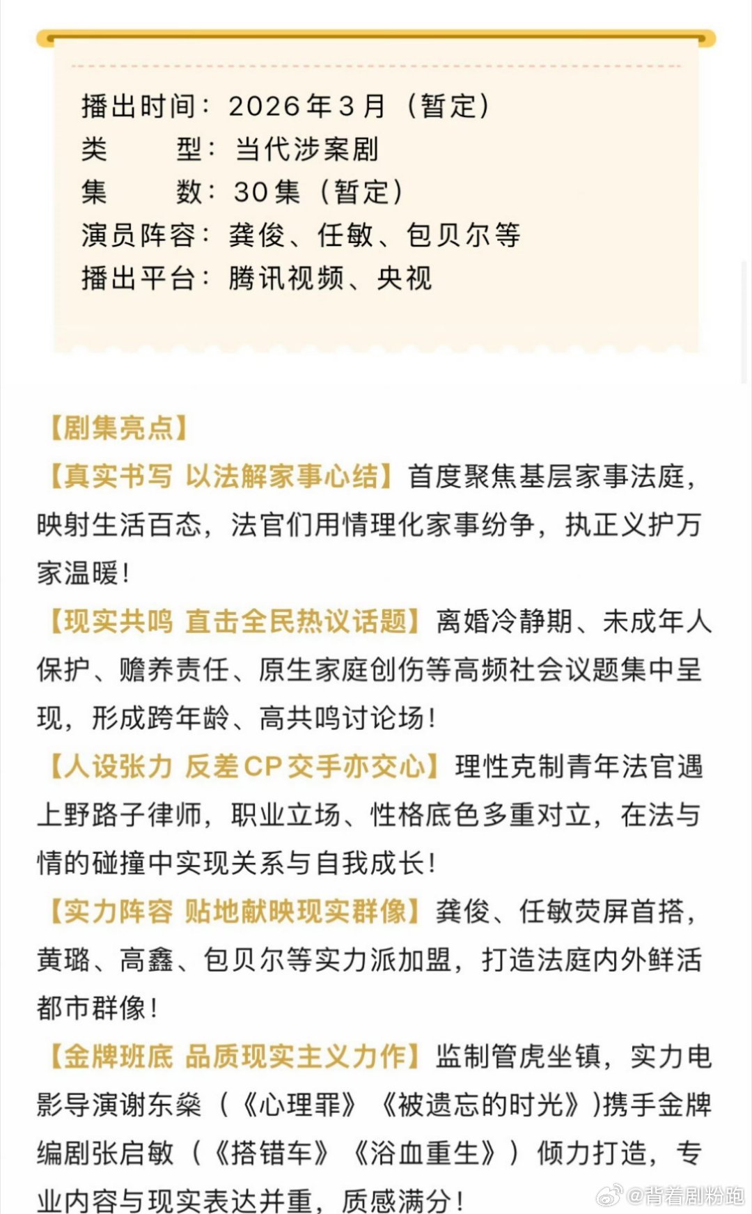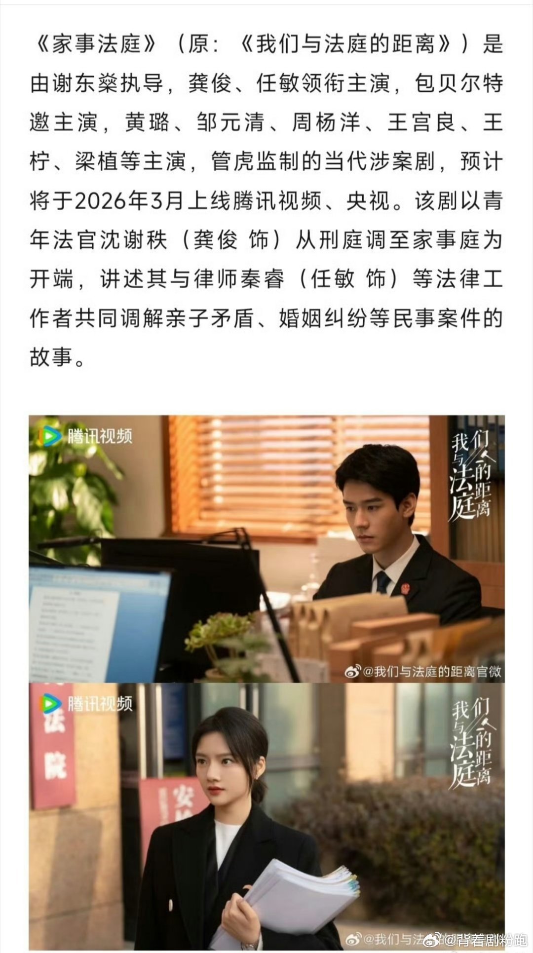 龚俊、任敏《家事法庭》播前招商,预计3月央视、腾讯视频开播,以法官视角展现温情