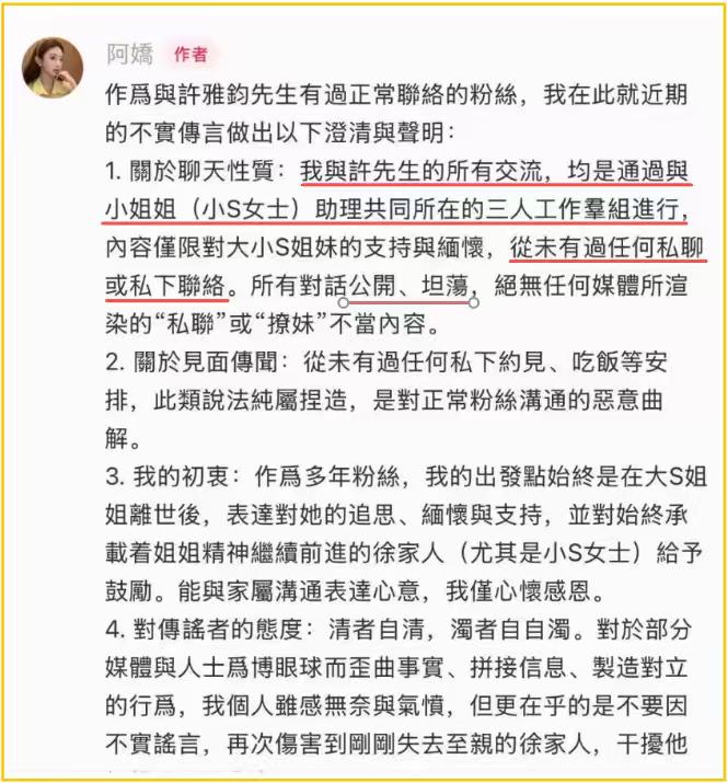 大S粉丝发文力挺许雅钧,然而她平时发的动态让网友怀疑她动机! 小S老公许雅钧被媒体曝光私联大S的年轻女粉丝,还发大S葬礼照给她,有撩妹之嫌。 许雅钧否认,称是为了感谢她对大S的喜爱之情。S妈也站在女婿这边,说他是太善良。 之后,大S粉丝也发文说自己只在和小S助理在的三人群组里聊天,没有和许雅钧进行过私下联络,更没有见面吃饭啥的。 然而网友翻看她的过往动态,有丑化张兰等内容,让人怀疑许雅钧把粉丝拉工作群,就是支持粉丝在网络平台上赞美徐家,骂汪家。 从另外角度证明了大S去世后,徐家不消停,专门组工作组来应对舆论。 这样看来,大S粉丝还不如不出来说话,真是说多错多!
