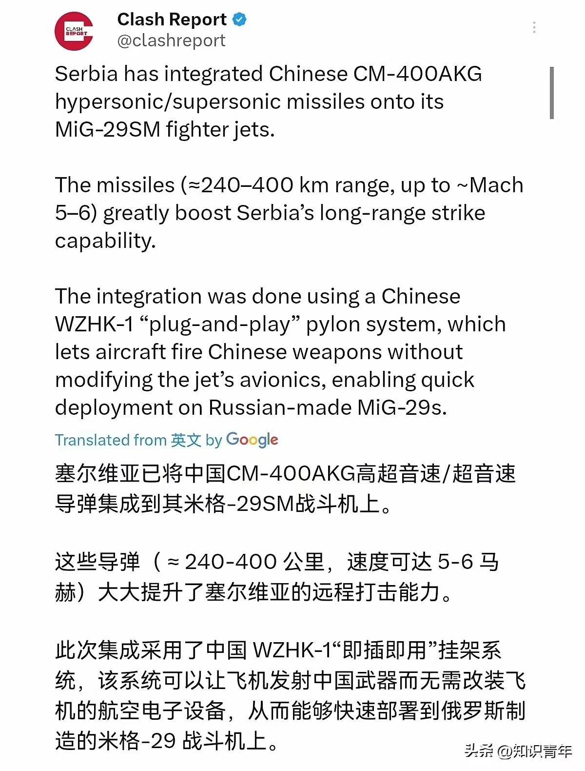 塞尔维亚受刺激了!塞尔维亚成为了欧洲首个列装中国超音速空射导弹的国家!塞尔维亚紧急将中国CM-400AKG高超音速导弹集成到其米格- 29战斗机上。3月11日,根据外媒报道,就在中东局势紧张之际,塞尔维亚紧急将射程240-400公里,速度高达~ 5-6马赫的CM-400AKG高超音速集成到了米格- 29战斗机了。外媒称,这一挂载将极大地增强塞尔维亚的远程打击能力。 这事儿听起来挺燃,一张照片就让欧洲防务圈炸了锅。但咱们别光看热闹,得琢磨琢磨背后的门道。塞尔维亚这个被北约国家几乎包围的巴尔干国家,突然给自家的老米格-29挂上中国造的“大杀器”,这可不是简单的武器买卖,更像是一次精心策划的战略突围。 武契奇政府精明得很。他们一边跟法国谈“阵风”战斗机的采购,维持着与欧盟的政治关系,另一边却悄无声息地引入中国导弹,给现役战机强行续命。为什么这么干?因为现实太骨感。塞尔维亚空军的那些米格-29,大多是上世纪八九十年代的老家伙,对地攻击能力基本停留在扔铁炸弹的水平。想从俄罗斯买新武器?俄乌冲突后这条路基本堵死,西方还层层施压。自己研发?没那个技术和资金。中国提供的这套“外置火控系统+CM-400AKG导弹”的组合,恰恰解了燃眉之急——不用换飞机,不用大改航电,花相对少的钱,就让老平台获得了以前想都不敢想的防区外精确打击能力。这买卖,划算。 CM-400AKG到底厉害在哪?简单说,就是“快”和“远”。末端速度超过4.5马赫,射程至少250公里,部分模式能达到400公里。这意味着塞尔维亚的战机可以在本国领空,或者远离敌方严密防空圈的安全空域,就发射导弹攻击周边国家纵深的高价值目标,比如指挥中心、雷达站、后勤枢纽。导弹速度极快,现有防空系统的反应窗口被压缩到以秒计算,拦截难度极大。更关键的是,这款导弹在巴基斯坦手里已经经历过实战检验,2025年曾用于打击印度的S-400防空阵地。对塞尔维亚来说,这不仅仅是获得了一件新武器,更是获得了一种可信的威慑手段,一种能让潜在对手在制定计划时不得不三思的“不对称筹码”。 但最让西方军事观察家惊讶的,恐怕不是导弹本身,而是“俄制平台+中国弹药”这种跨体系整合居然真的成功了。米格-29是纯粹的苏联技术体系,航电架构、数据总线和中国武器原本不兼容。中方提供的解决方案很巧妙:一个集成了火控计算机和导航模块的“智能挂架”。它就像个“外挂大脑”,通过这个挂架,老旧的米格-29就能和先进的CM-400AKG“对话”,完成目标装订、发射引导等一系列操作。这套思路的价值,可能比卖几枚导弹更大。它向全球大量还在使用俄制老旧战机的国家(从埃及、阿尔及利亚到缅甸、孟加拉国)展示了一条低成本、高效率的战斗力升级路径。既然俄罗斯现在自顾不暇,那为什么不试试中国的升级方案呢? 那么,挂上中国导弹的塞尔维亚,就能一举改变巴尔干的力量平衡吗?恐怕没那么简单。军事威慑不光看一两件先进武器,更要看整个作战体系的支撑。塞尔维亚空军规模小,战机数量有限,缺乏强大的空中预警、电子战和体系化作战能力。几架挂载新导弹的米格-29,能形成一定的战术威胁,但还不足以挑战北约的整体空中优势。它的真正意义在于“破局”和“信号”。它打破了欧洲高端防务市场被美英法德垄断的固有格局,证明了中国高端进攻性武器有能力进入欧洲市场。它也向外界传递了一个清晰信号:塞尔维亚不愿被任何一方完全捆绑,它正通过装备来源多元化,在复杂的地缘政治夹缝中,竭力维护自己的战略自主性。 对中国军工出口而言,塞尔维亚是一个极具价值的“样板间”。它证明了中国不仅能卖整机,更能提供灵活、定制化的“能力模块”,帮助客户盘活存量资产。这种不附加政治条件、切实解决用户痛点的合作模式,在当今世界很有吸引力。当然,挑战也不少,比如如何应对西方的政治压力,如何建立更完善的海外后勤保障体系。但无论如何,那架挂着中国导弹的米格-29飞过巴尔干上空,已经是一个无法忽视的起点。它改变的,或许不是明天的胜负,而是游戏参与者的思维和未来的可能性。 各位读者你们怎么看?欢迎在评论区讨论。
