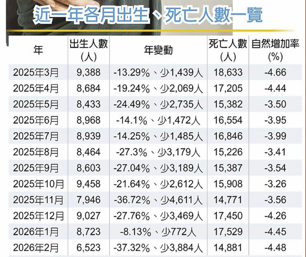 台湾省以后的移民大概率多!¹ 总人口居然以每天300人的速度减少!⚠️2月新出生人口只有6523!
