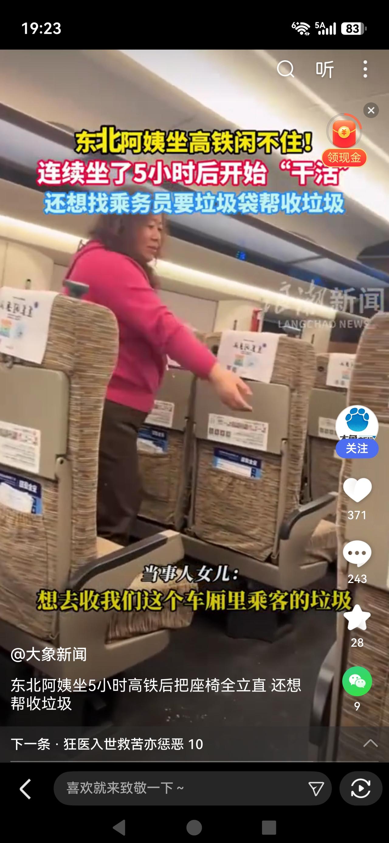 《5小时高铁,东北阿姨愣是没闲着!网友笑完破防:勤劳是刻在DNA里的》 一位东北阿姨乘坐5小时高铁后,见车厢空座椅背东倒西歪,主动起身将座椅一一调直归位,还想找乘务员要垃圾袋帮忙清理垃圾,被女儿劝阻。这一朴素举动走红网络,网友纷纷点赞,称其是“编外保洁”,背后是老一辈人勤劳、热心、不给他人添麻烦、处处为他人着想的本能,对比公共场所不文明行为,更显珍贵与温暖。 看完这段真的又好笑又好哭!这东北阿姨哪是闲不住,明显的是善良和教养在“自动运行”。坐了5小时高铁,谁能不累?可她眼里看见乱糟糟的座椅,顺手就整理干净,还帮着把垃圾一起收拾了,这份热心肠真的太打动人了。 好多人在说,这就是咱爸妈辈的通病:看不得乱、见不得脏、有活儿就想搭把手。在他们心里,不给别人添乱、顺手帮个忙,是最基本的体面。没有豪言壮语,没有刻意表演,就是最自然的本能反应。 现在高铁上、公共场所,总有人只顾自己舒服,座椅乱调、垃圾乱扔,完全不顾及下一位乘客和工作人员。阿姨用一个小小的举动告诉我们:真正的素质,藏在没人看见的细节里;真正的善良,是不用提醒的自觉。 这不是多管闲事,是刻在中国人骨子里的温柔。网友纷纷晒出同款爸妈,评论区直接破防。善良从不分大小,温暖总在不经意间。为这位可爱的东北阿姨点赞,愿我们都能守住这份朴素的善意!热点话题 高铁东北阿姨帮干活