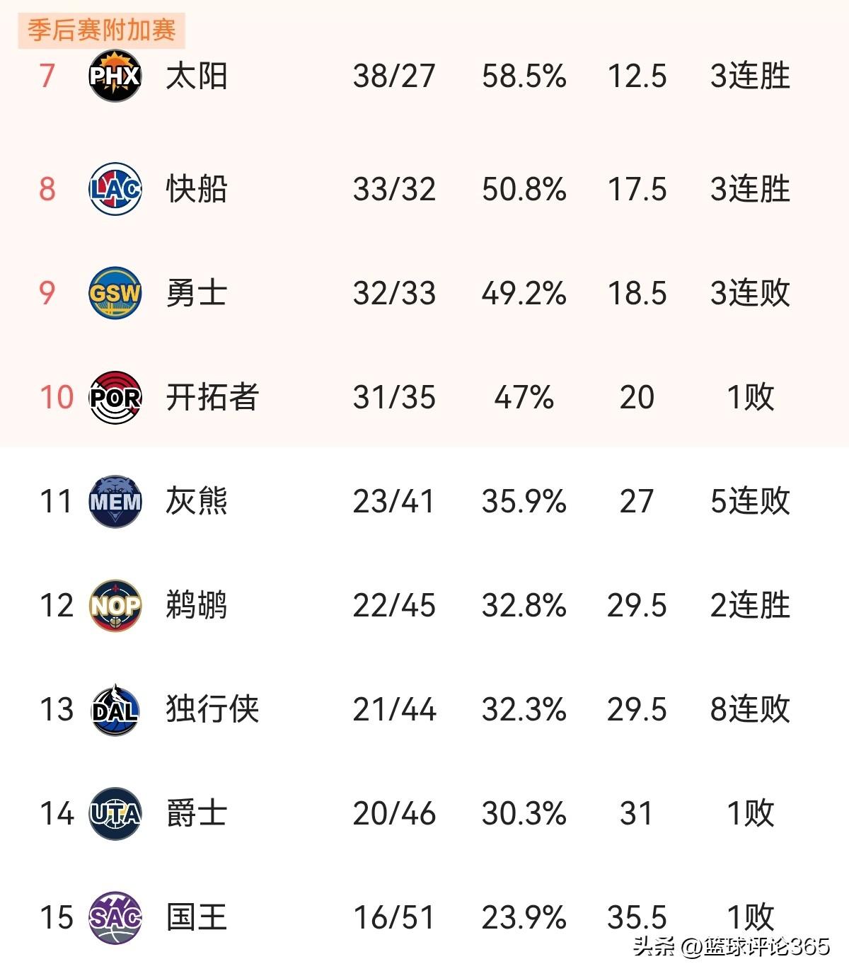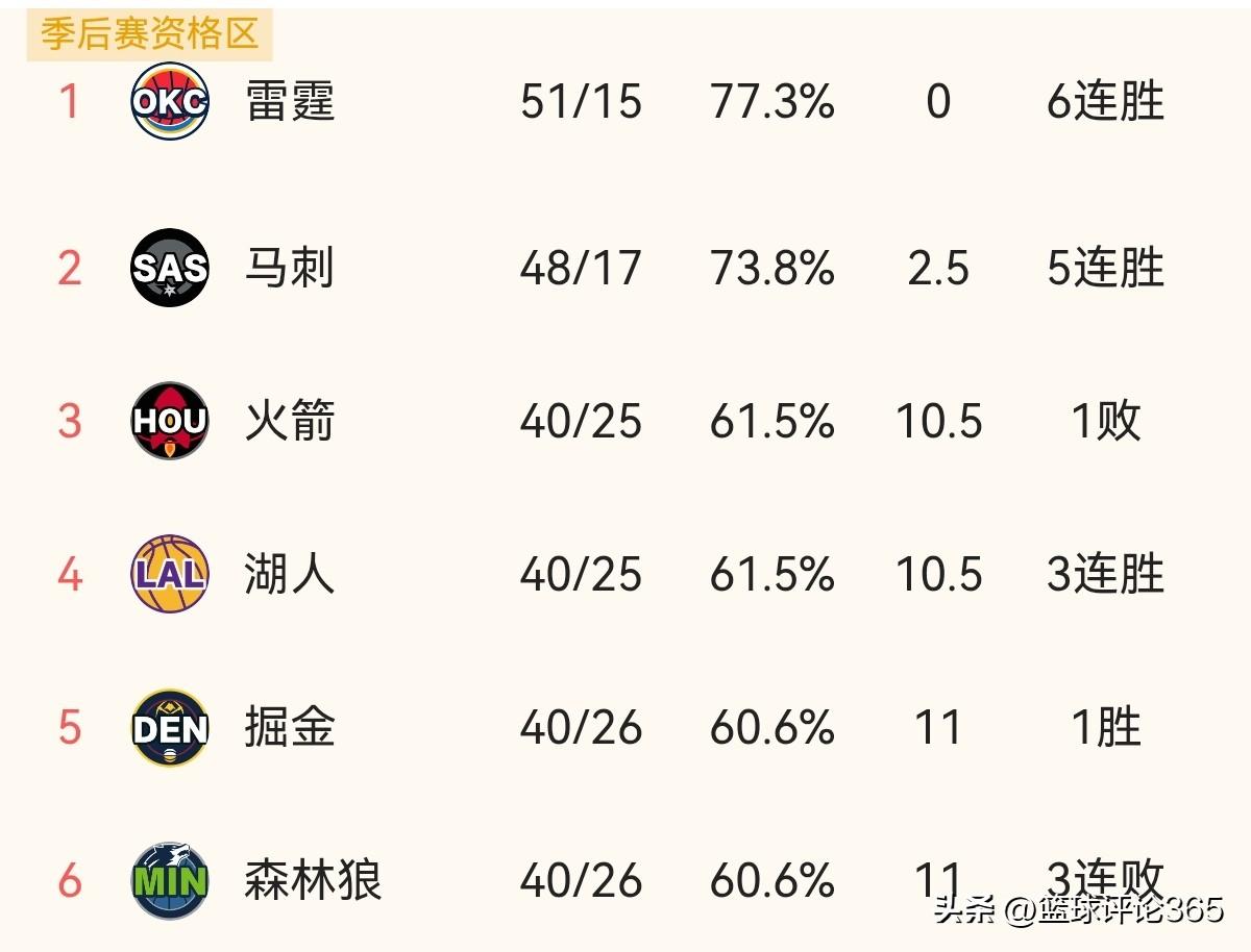西部排名榜太刺激:掘金击败火箭彻底扰乱排名,第3-6名仅0.5个胜场差,快船153分狂飙3连胜。 今天的NBA常规赛可谓是精彩纷呈,西部排名榜更是上演了一出“生死时速”的大戏!从火箭对阵掘金这场比赛开始,整个西部的格局就被彻底搅乱了。 掘金主场129-93大胜火箭,这一战直接导致西部第3到第6名的竞争进入白热化阶段!目前火箭40胜25负排在第三,湖人同样40胜25负紧随其后,掘金40胜26负位列第五,森林狼40胜26负排在第六。从第三到第六,最大胜场差仅仅0.5场!这意味着一天之内,排名就可能发生天翻地覆的变化。火箭今天惨败掘金,优势正在被一点点蚕食;而掘金赢球后气势正盛,冲击前三的希望大增。 再看另一场焦点战,快船主场153-128狂胜森林狼,轰下了本赛季球队单场最高分!伦纳德砍下45+5+5,加兰21分6助攻,马瑟林22分。三连胜后,快船33胜32负稳居西部第八,更恐怖的是,当快船能轰下153分时,任何对手都会感到胆寒。 森林狼虽然还排在第六,但三连败的颓势让人担忧。爱德华兹再猛,也架不住全队防守崩盘。如果继续保持这种状态,他们随时可能掉入附加赛区。 西部前六的争夺已经进入白热化,而附加赛区的厮杀同样惨烈。太阳38胜27负第七,快船第八,勇士32胜33负第九,开拓者31胜35负第十。勇士缺兵少将,近期遭遇三连败;开拓者则紧咬不放,随时准备取而代之。 至于鹈鹕、独行侠、爵士、国王,本赛季基本已经可以提前宣告结束了。独行侠8连败,国王16胜51负垫底,昔日的豪门沦落到这般田地,令人唏嘘。常规赛还剩最后20场左右,西部的每一场比赛都将是一场决战。火箭能否守住前三?快船能否冲进前六?湖人会不会掉入附加赛?让我们拭目以待!