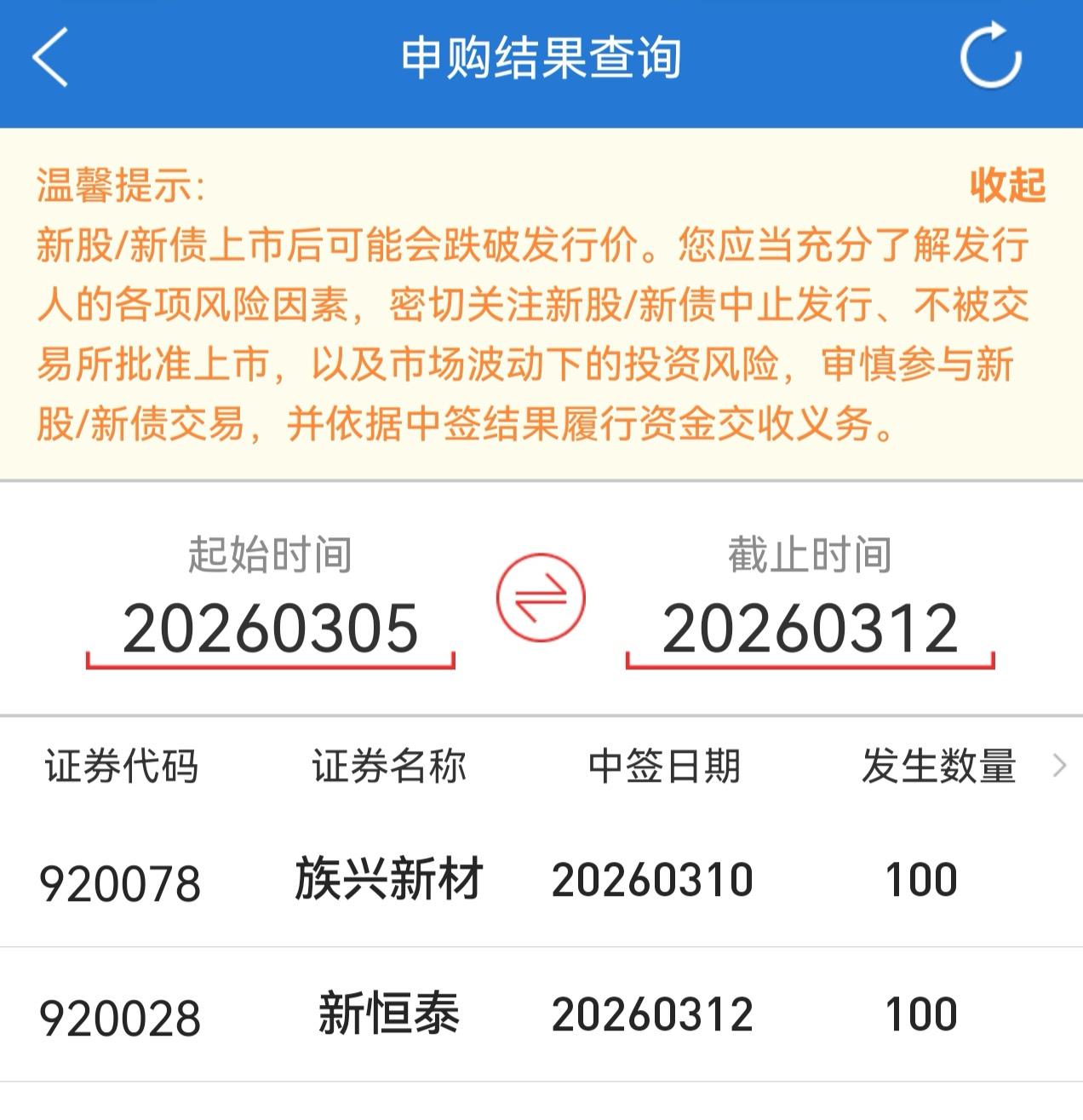 昨天280万申购了北交所新股新恒泰,今天晚上开奖,中了100股。 上市涨到15元的话,这100股只能赚500元……… 比逆回购利息稍微高那么一丁点。 和以前的收益率比,真是天差地别啊!等以后那天破发的话,大概又没有人会去申购了。[酷拽][酷拽][酷拽] 晒图记录生活