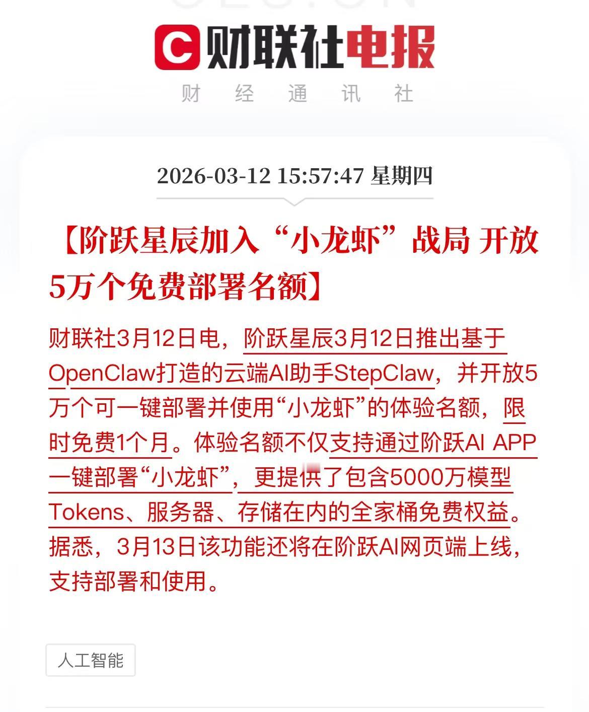 【阶跃星辰加入“小龙虾”战局 开放5万个免费部署名额】 阶跃星辰3月12日推出基于OpenClaw打造的云端AI助手StepClaw,并开放5万个可一键部署并使用“小龙虾”的体验名额,限时免费1个月。体验名额不仅支持通过阶跃AI APP一键部署“小龙虾”,更提供了包含5000万模型Tokens、服务器、存储在内的全家桶免费权益。据悉,3月13日该功能还将在阶跃AI网页端上线,支持部署和使用。