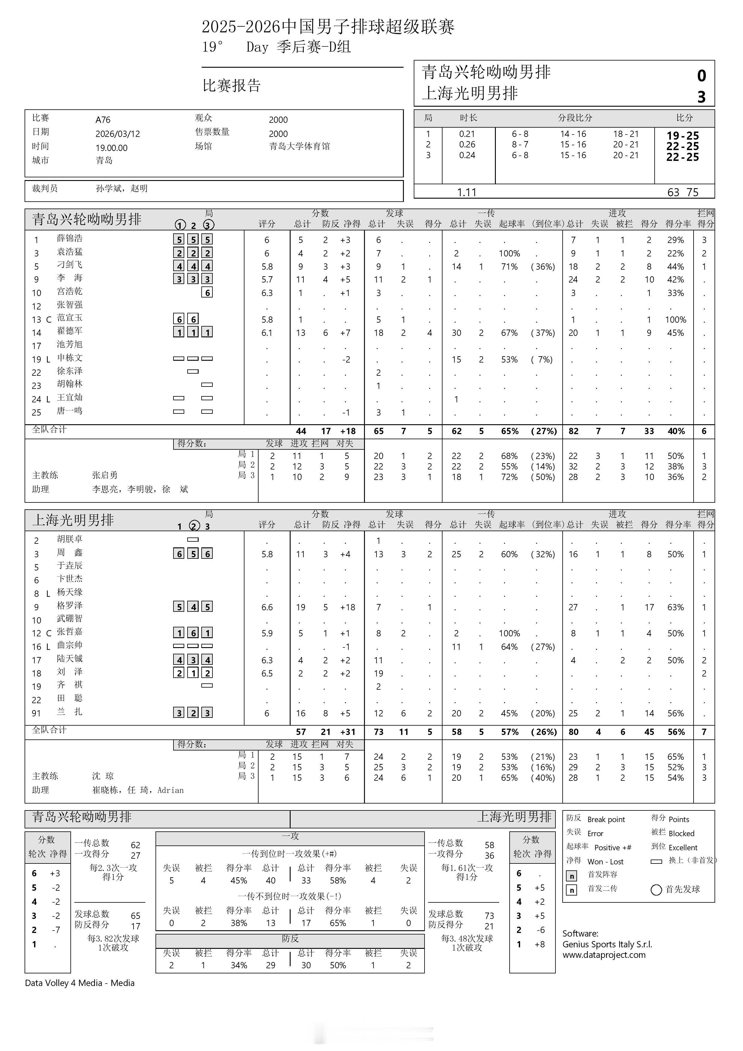 【中国男排超级联赛 青岛0-3上海】3月12日晚,A级季后赛总第19轮,D组的青岛以0-3(19-25, 22-25, 22-25)不敌上海。翟德军13分,李海11分,刁剑飞9分;格罗泽19分,兰扎16分,周鑫11分。