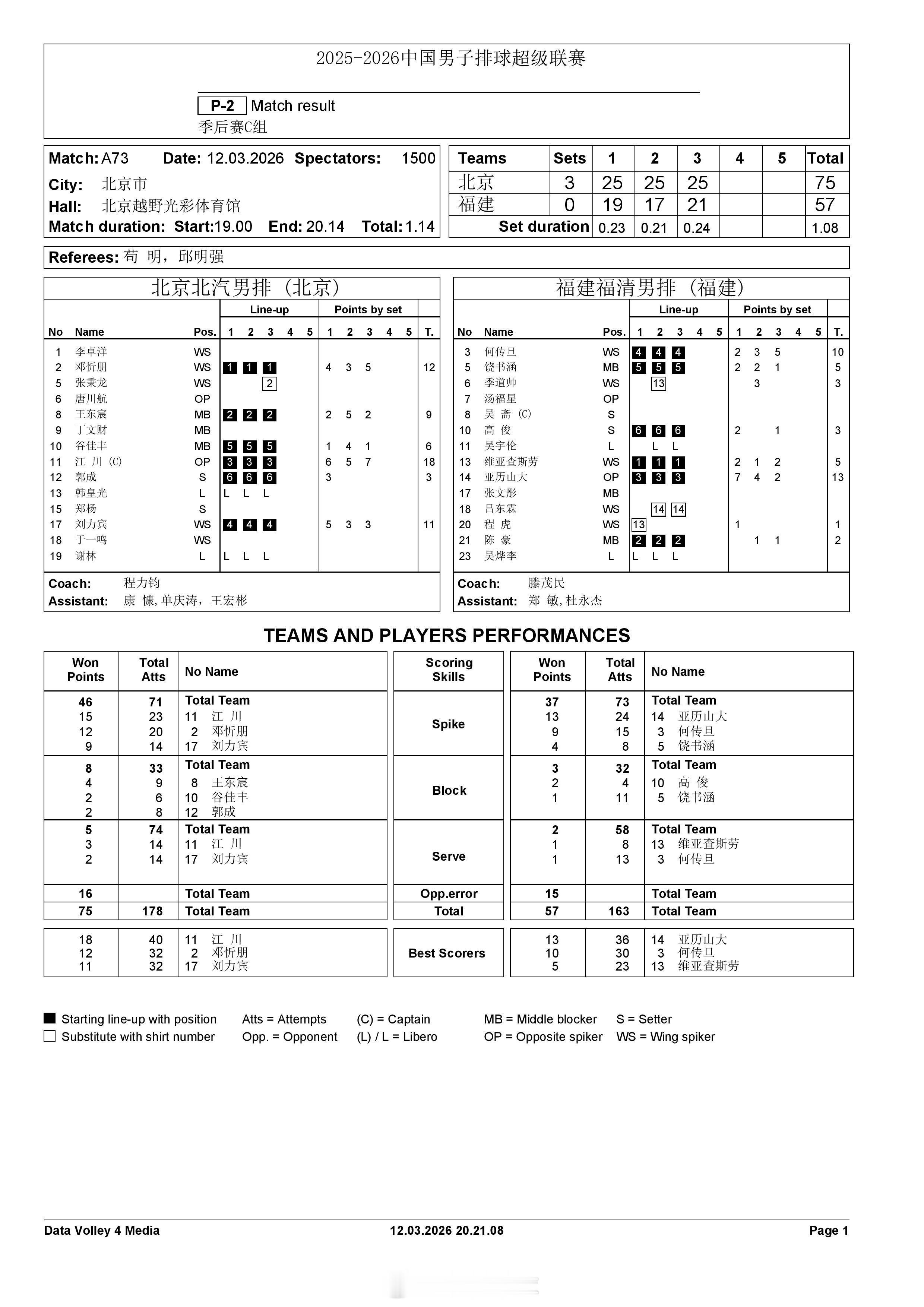【中国男排超级联赛 北京3-0福建】3月12日晚,A级季后赛总第19轮,C组的北京主场3-0(25-19, 25-17, 25-21)完胜福建。江川18分,邓忻朋12分,刘力宾11分,王东宸9分(拦4);亚历山大13分,何传旦10分。