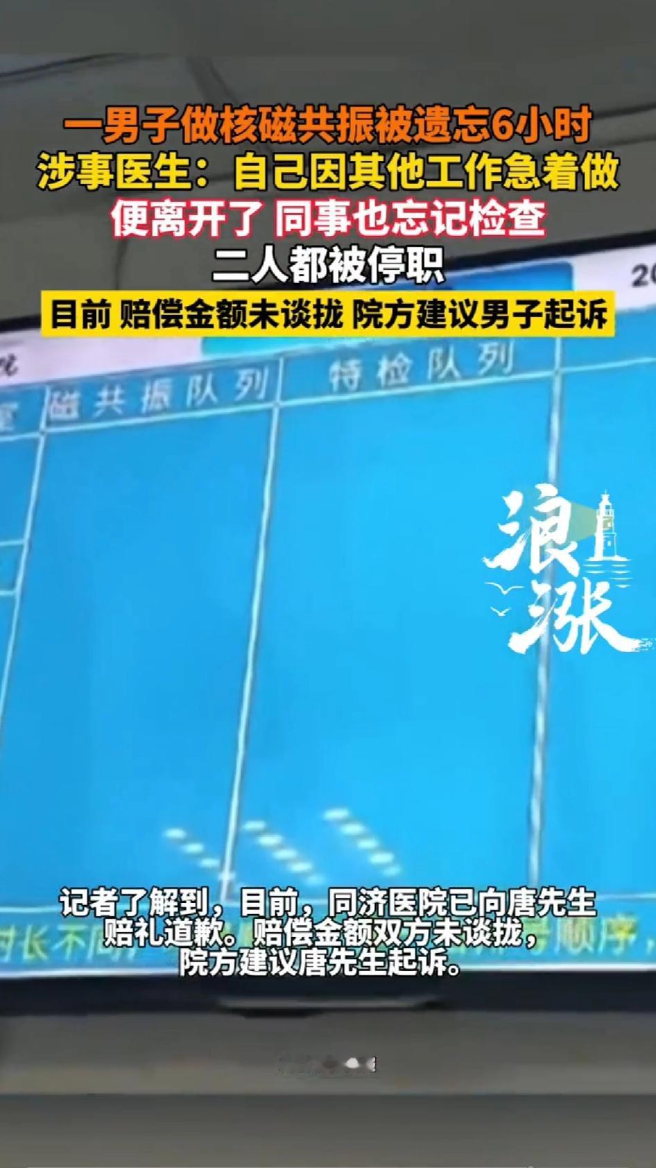 一男子做核磁共振被遗忘6个小时,涉事医生:自己因其他工作着急做便离开了,同事也忘记检查。二人都被停职!目前赔偿金额暂未谈拢,院方建议男子起诉。 武汉这事儿太离谱了!2月25日晚唐先生去做核磁共振,凌晨0时躺在机器上,结果被遗忘了整整6个小时。他半小时后就开始喊,“怎么还没做完”“有人吗”,喊了一遍又一遍,愣是没人理。他本想自己脱困,可机器在响又不敢动。 做核磁共振被推进去,里面就会轰隆隆响起来,里面的人就是大声喊外面的人也听不到。负责检查的工作人员太粗心大意了,一个患者在里面居然待了6个小时都不知道,不是患者妻子报警还不知道多久会被发现。 只要在岗,无论什么原因医护人员都应该把患者放在第一位。 这倒好患者躺进去6个小时没出来,医护人员居然都没发现,显然医院管理出现了问题,医护人员连最基本的职业道德都没有。 男子被困6个小时,直到清晨保洁员来打扫,听到喊声喊来保安,他才“脱困”。涉事医生说因其他工作着急做就离开了,同事也忘了检查。 这责任心也太差了吧!唐先生老婆还因为他迟迟未归赶到医院报警,保安却称他已做完检查。还好人没事,涉事医生和同事被停职,科室也整改了,希望以后别再出这种离谱事儿。