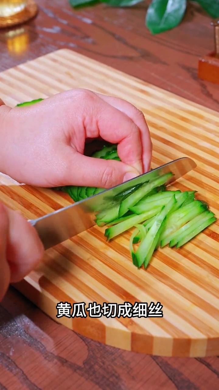 凉拌土豆丝。 家人们注意看,我家孩子从小就特别喜欢吃土豆,每年一到夏天天热的时候,我都会经常给他们做这道凉拌土豆丝,酸辣爽口,特别好吃。 ·3毛一斤的土豆,像我这样切上一刀,再给它放倒,这样土豆就不会打滑了。土豆片尽量切的薄厚均匀一些,这样就算你是厨房新手,也能切出漂亮的土豆丝来。 ·再用黄河水把土豆的淀粉洗掉,防止氧化变黑。 ·接着准备香菜切成小段,辣椒切成细丝,再把树上摘来的黄瓜也切成细丝。 ·锅中水开,下入土豆丝,加半勺白醋,这才是土豆丝口感爽脆的关键。 ·焯水1分钟后捞出来,用凉水投凉。 ·攥干水分后放入碗里,再放上切好的香菜段和辣椒丝,88粒油炸花生米。 ·空碗里加入蒜末、黑芝麻、干辣椒,用热油浇香。 ·调味非常简单,只需要加一点这个酒店大厨都在用的酸辣凉拌汁,用我可爱的手给它翻拌均匀就可以开吃了。 不油不腻,清脆爽口,一上桌我家5个儿子都抢着吃。 喜欢你也收藏做起来吧!