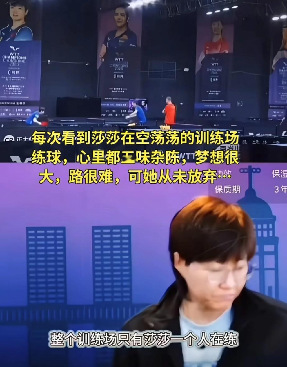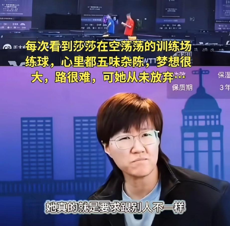 郭焱感慨莎莎一个人的训练场。 比完赛莎莎因为不满意自己赛场上某个球的表现,赛后就在训练馆里加练,教练员陪着。莎莎是想多练练。找到解决问题的办法,就要多加练习,不练第二天比赛还是个隐患。这就是莎莎,今日事今日毕。碰到问题就赶紧解决。 郭焱说:“真的训练员到达一定的程度,就和别人不一样,怎么能一样呢。” 莎莎是唯一的!太拼了!
