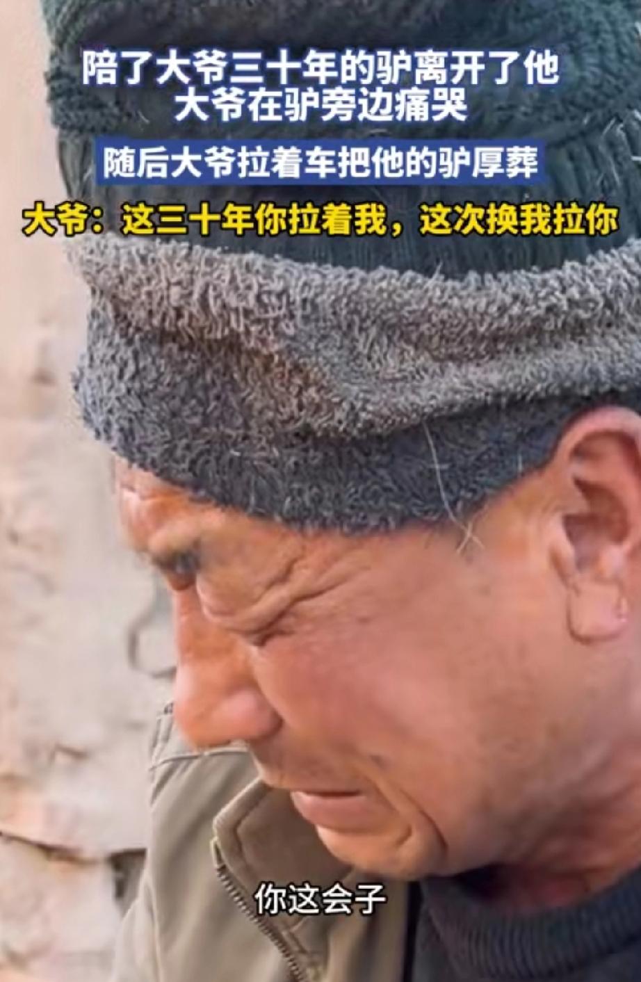 太戳心!大爷与陪伴自己整整三十年的老驴感情深厚,老驴突然离世,大爷在驴的身边痛哭不止,难掩悲痛,之后还专门拉着车,亲手将老驴厚葬。 这头老驴跟着大爷走过了三十年的风风雨雨,在这家里,早就不是一头普通的牲口,更像是大爷最亲的老伙计、家里的一份子。大爷:宝驴,听我话的很! 三十年来,宝驴陪着大爷耕地、拉货、走山路,不管日子多苦多累,都忠心耿耿地守在大爷身边,默默帮衬着撑起整个家。 可岁月不饶人,也不饶动物,宝驴终究还是走到了生命的尽头。当大爷发现宝驴离世时,一下子没忍住,蹲在老驴的身边失声痛哭,那哭声里全是不舍和心疼,看得人心里直发酸。 之后,大爷特意找来车子,小心翼翼地把宝驴抬上车,亲手拉着车,大爷说:“这三十年你拉着我,这次换我拉你!”找了块好地方将老驴厚葬,用最郑重的方式,和这位陪伴了自己半生的老伙计告别。 有网友说:“三十年了,它陪着你从年轻小伙变成中年大叔,驮过的粮食比你走过的路都多,这份情,外人真体会不到。” 确实,在农村长大的孩子,或者有过这种经历的人都能懂。这些不会说话的牲口,吃的是一把草,干的却是最累的活。 它们沉默地陪着主人度过一年又一年,看着这家人的日子一点点好起来。等到老了,干不动了,有的被卖掉,有的…… 就这么倒在了它生活了一辈子的院子里。就像这位大哥的宝驴,它把最后一口力气,都留在了这个家。 三十年,一万多个日夜。老驴陪着大爷熬过了无数苦日子,它见过大爷的汗水,也分享过大爷的喜悦,早已成为大爷生命里不可或缺的一部分。 大爷的痛哭,不是矫情,是真真切切的失去之痛;他拉车厚葬的举动,更是把这份感情看得比什么都重。 我们总说人情淡薄,而最纯粹的感情从来都不分物种,只要真心相待,就能相伴一生。这种不掺任何杂质的陪伴 这头驴或许记不得那么多,但它一定记得,每天清晨主人添草料时粗糙又温暖的手,记得春耕时一起流过的汗,记得冬天那个透风但安稳的棚子。 老驴用一生的忠诚,回报了大爷的养育;大爷用最后的厚葬,回应了老驴的陪伴